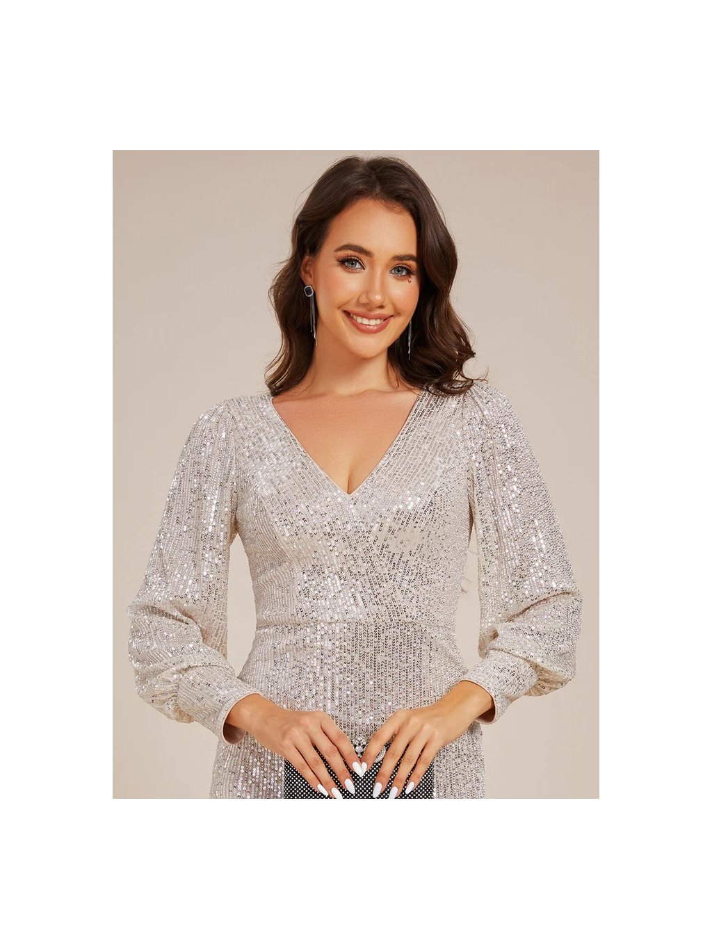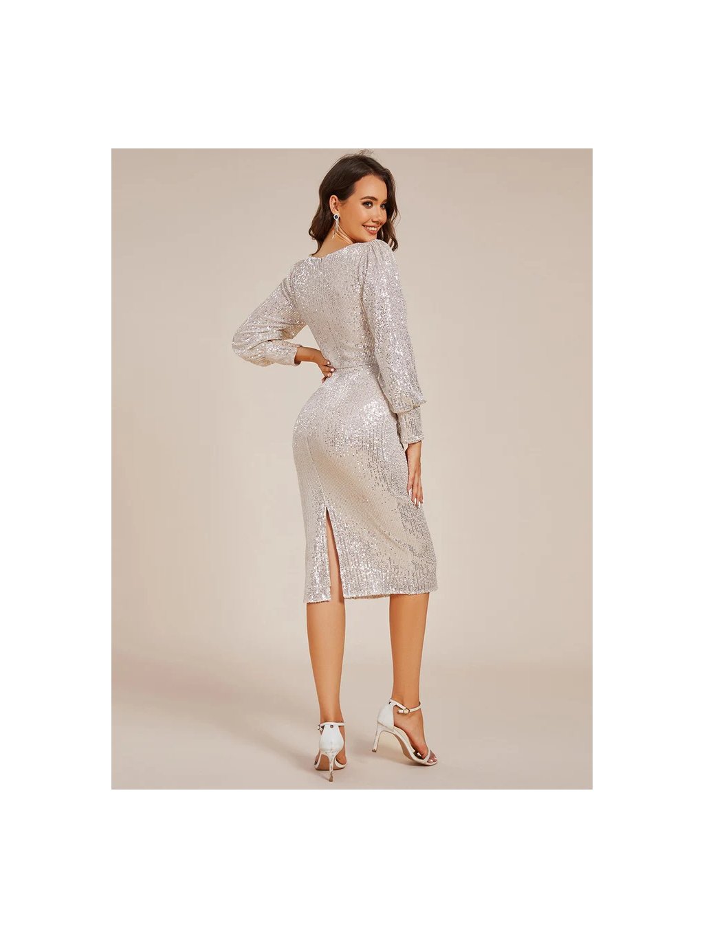 Luxusní dámské krátké šaty černé s odlesky. Šaty mají na prsou velký výstřih. Délka je pod kolena. Šatičky mají dlouhé rukávy.