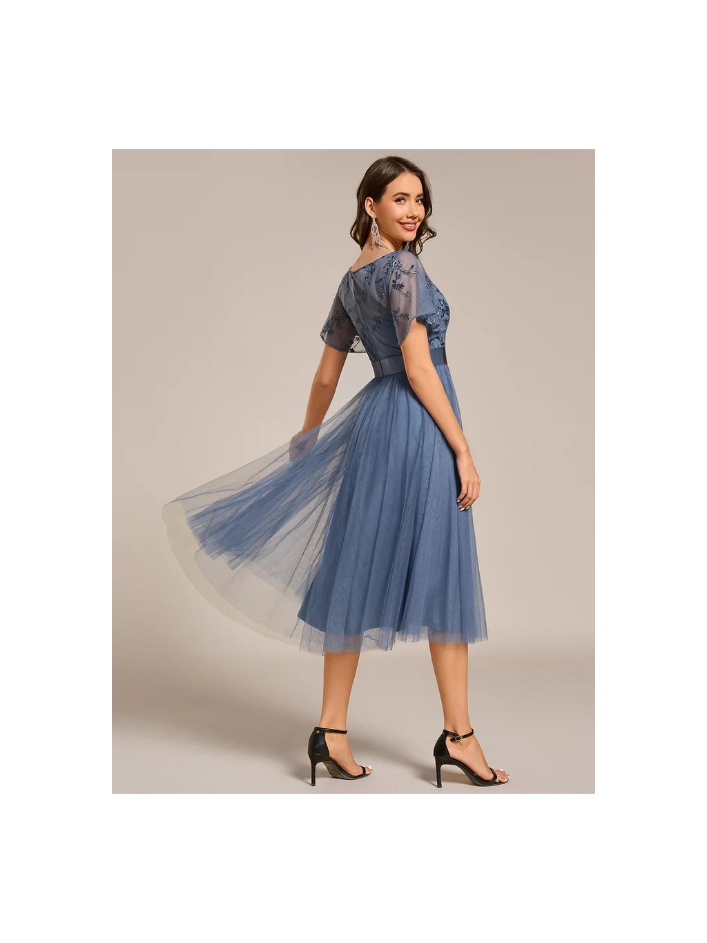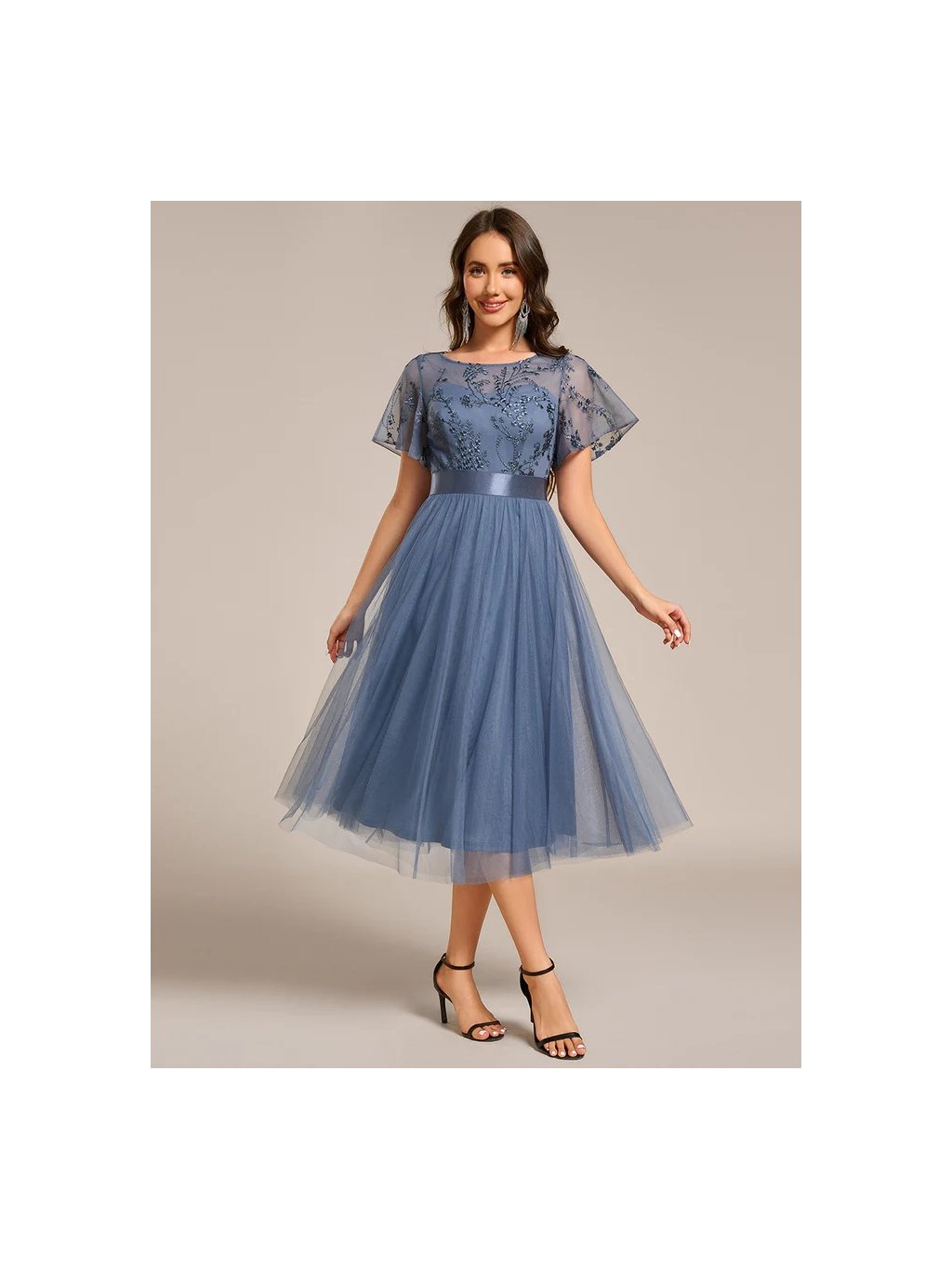 Společenské šaty Ever Pretty. Šaty mají krátký rukáv, na prsou mají výšivku. Sukně je bohatá, s volánky