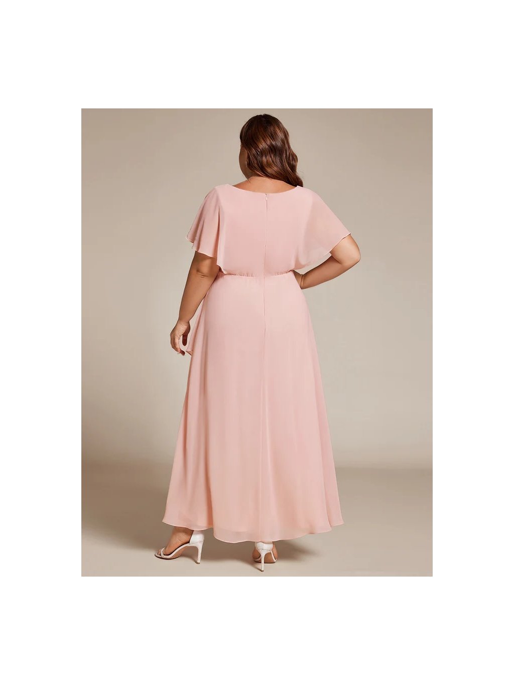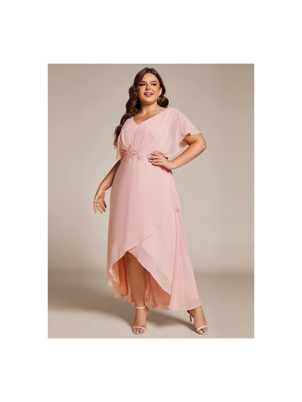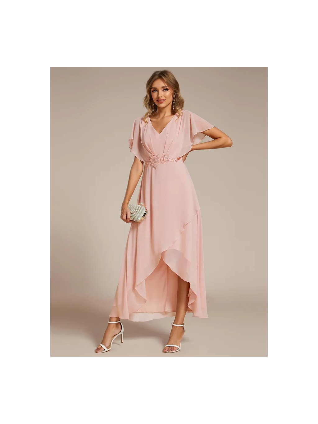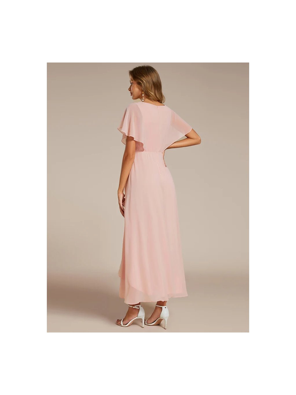 Jemné šifonové šaty s krátkými rukávy, dokonalý jednoduchý design. Šaty mají midi délku a asymetrickou sukni, ideální pro svatební hosty či družičky.