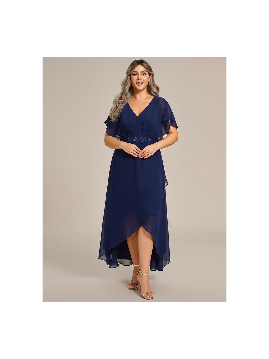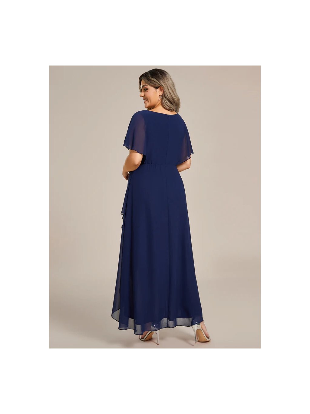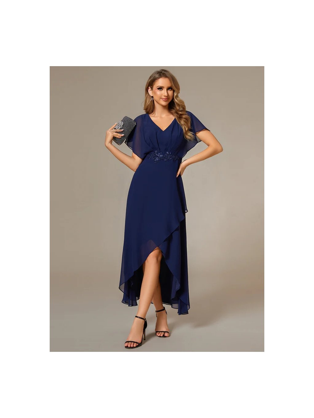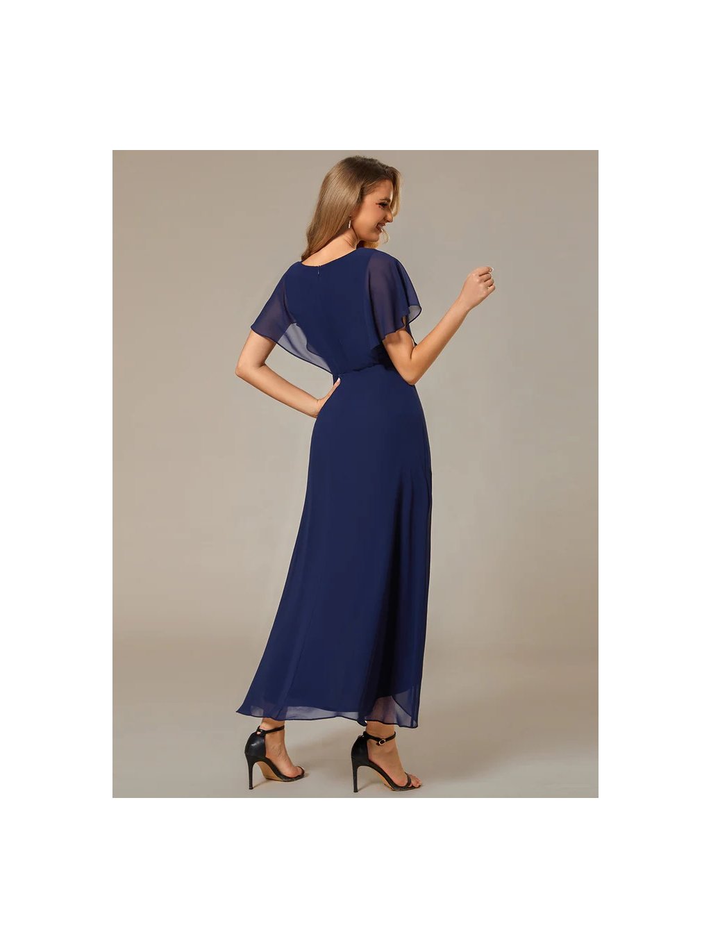 Jemné šifonové šaty s krátkými rukávy, dokonalý jednoduchý design. Šaty mají midi délku a asymetrickou sukni, ideální pro svatební hosty či družičky.