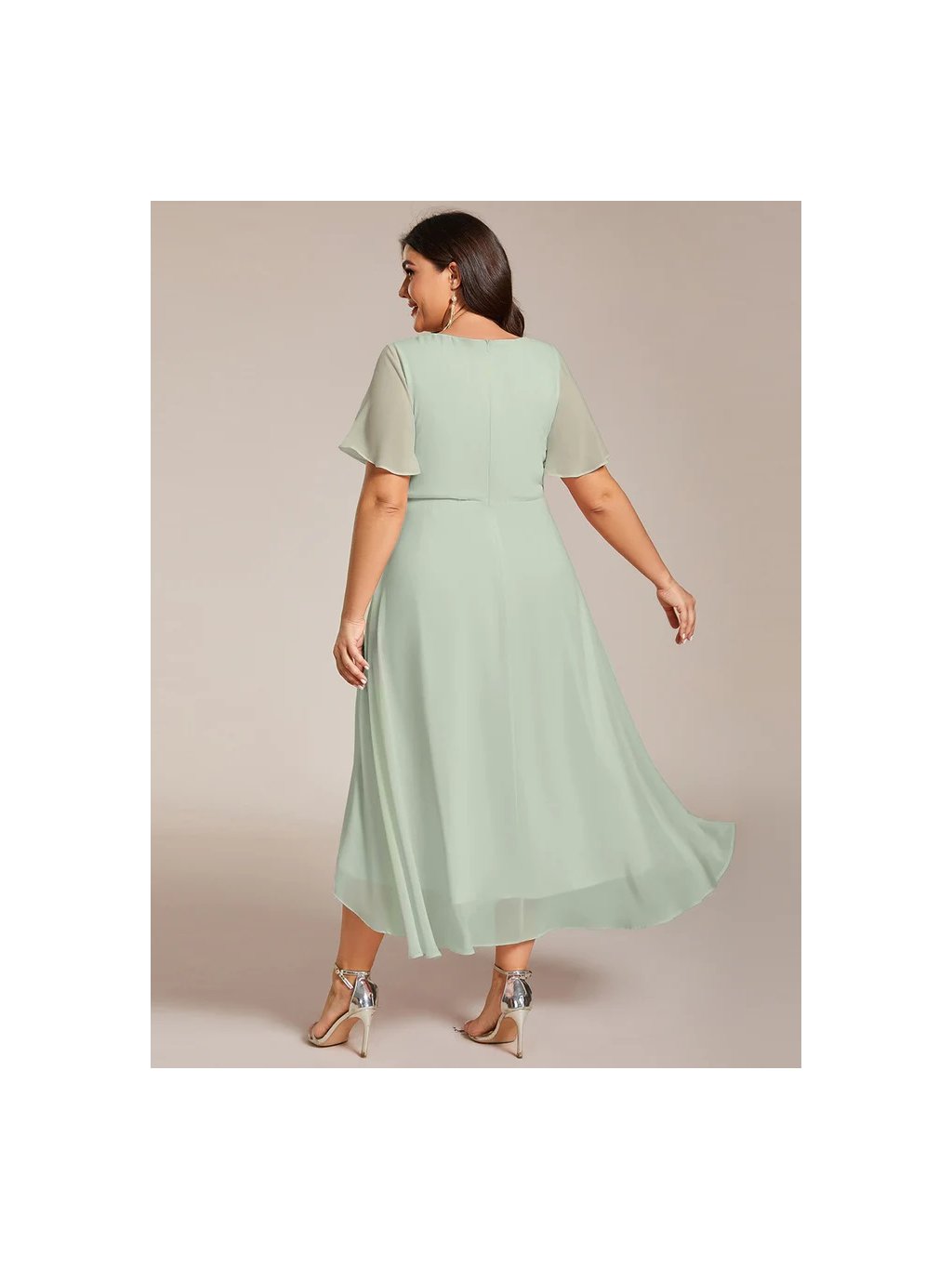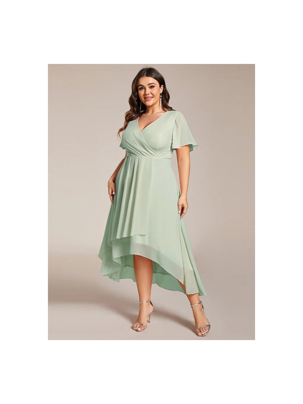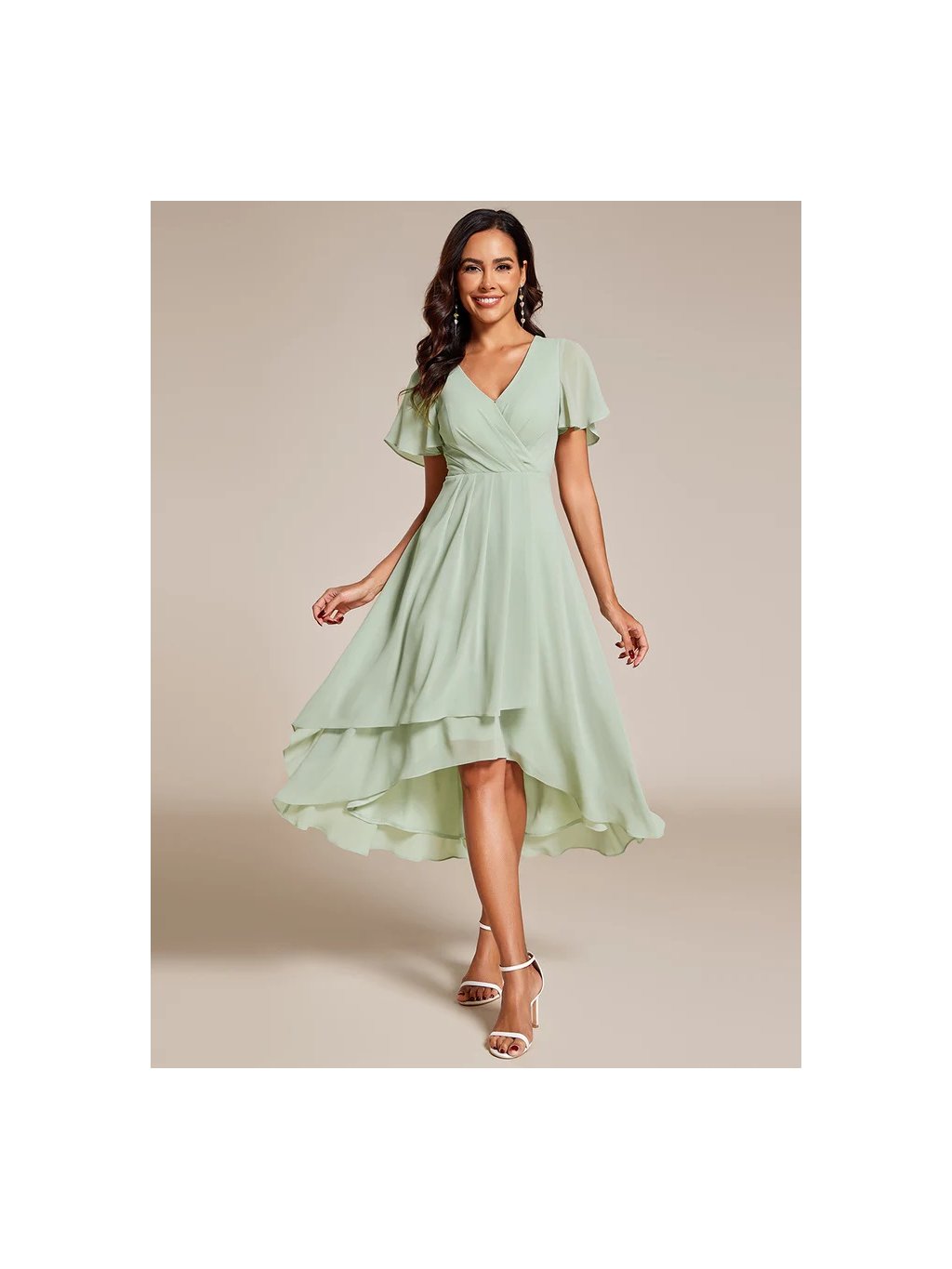 Jemné šifonové šaty s volánovým rukávem,výstřihem do V dokonalý jednoduchý design. Šaty mají midi délku a asymetrickou sukni, ideální pro svatební hosty či družičky.