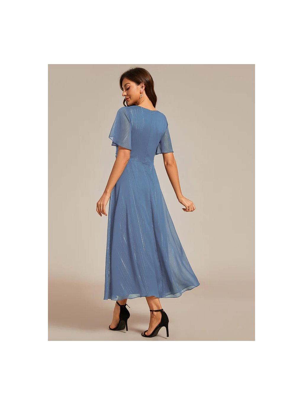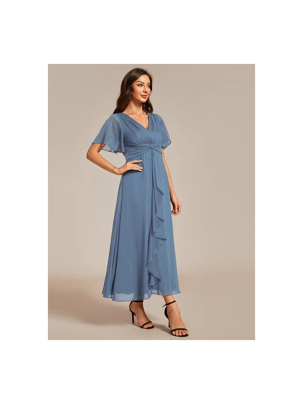 Jemné šifonové šaty s krátkými rukávy, dokonalý jednoduchý design. Šaty mají délku sukně ke kotníkům, Elegantní šaty v lesklém stylu s výstřihem do V pod prsy skládané.