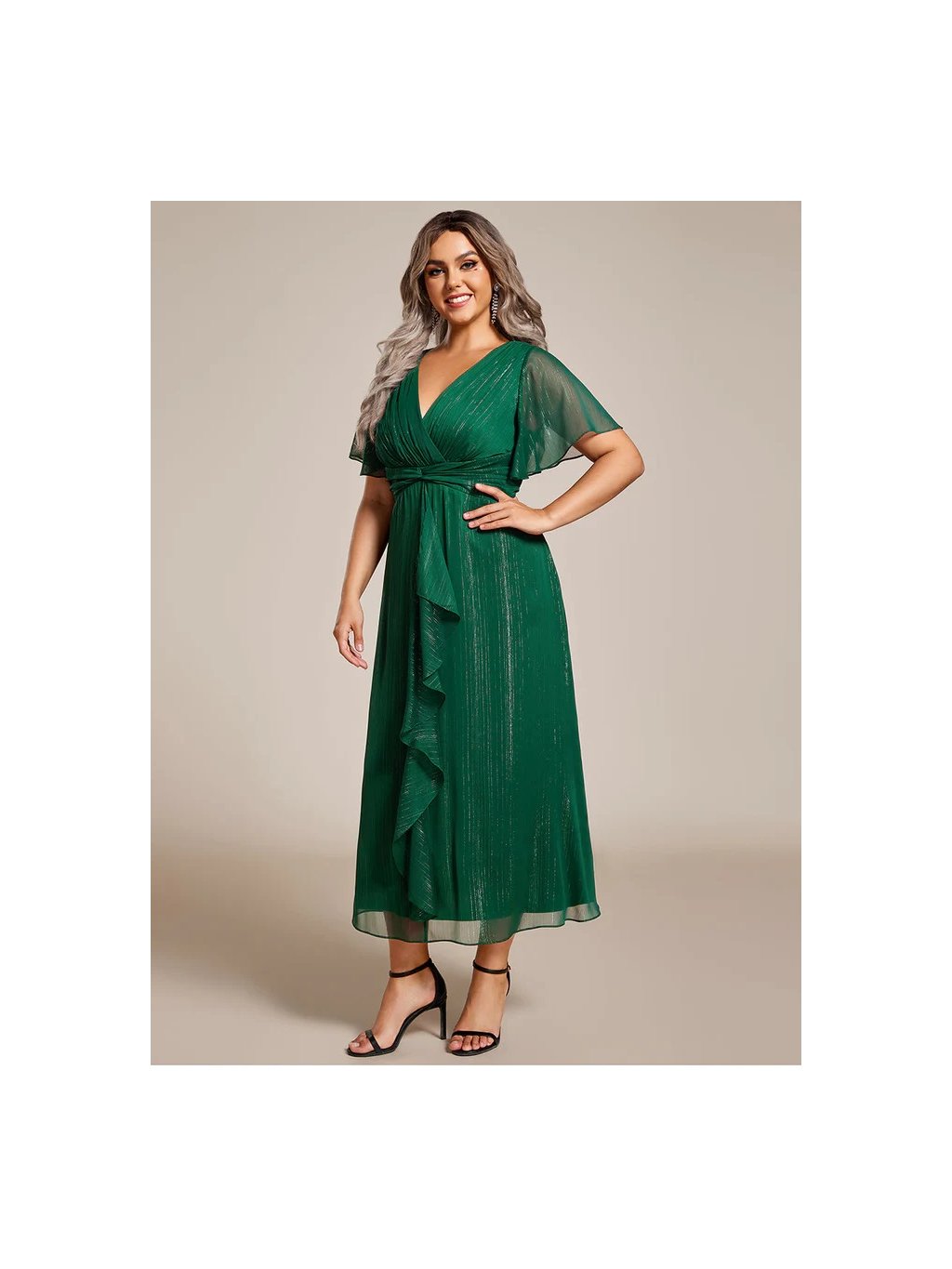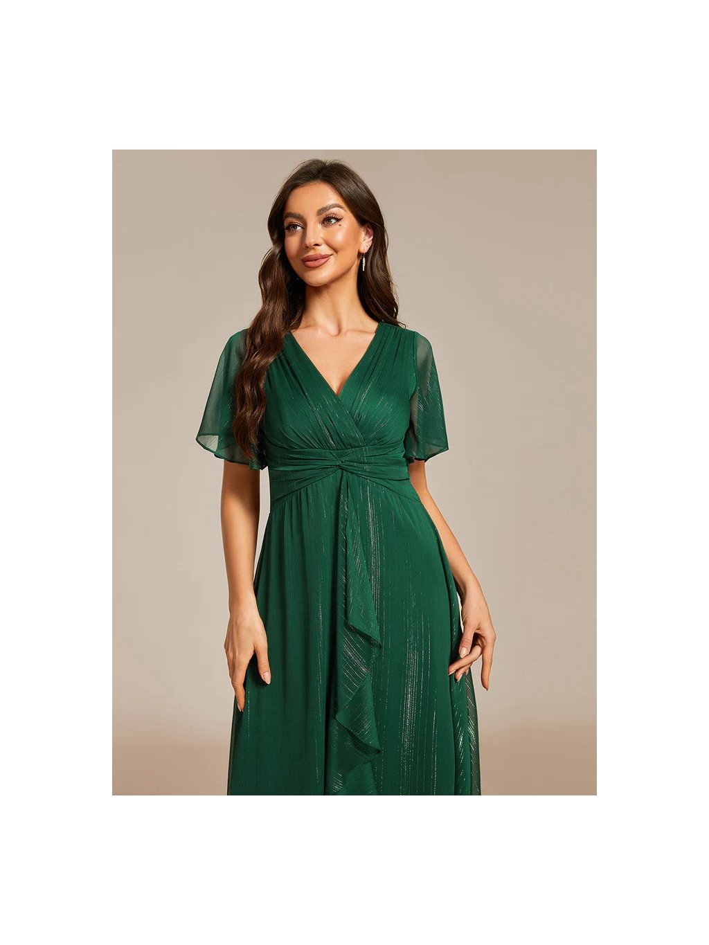 Jemné šifonové šaty s krátkými rukávy, dokonalý jednoduchý design. Šaty mají délku sukně ke kotníkům, Elegantní šaty v lesklém stylu s výstřihem do V pod prsy skládané.