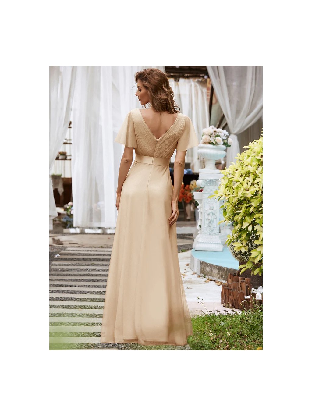 Luxusní dlouhé šaty Ever Pretty. Šaty mají na prsou i zádech hluboký véčkový výstřih. Mají průhledné krátké a volné rukávky. Na zádech mají skrytý zip. Sukně je velmi bohatá je tylová. Šukně je mírně průhledná, pro větší objem a neprůhlednost doporučujeme pod šaty spodničku. Šaty krásně padnou a dělají velmi pěknou postavu.