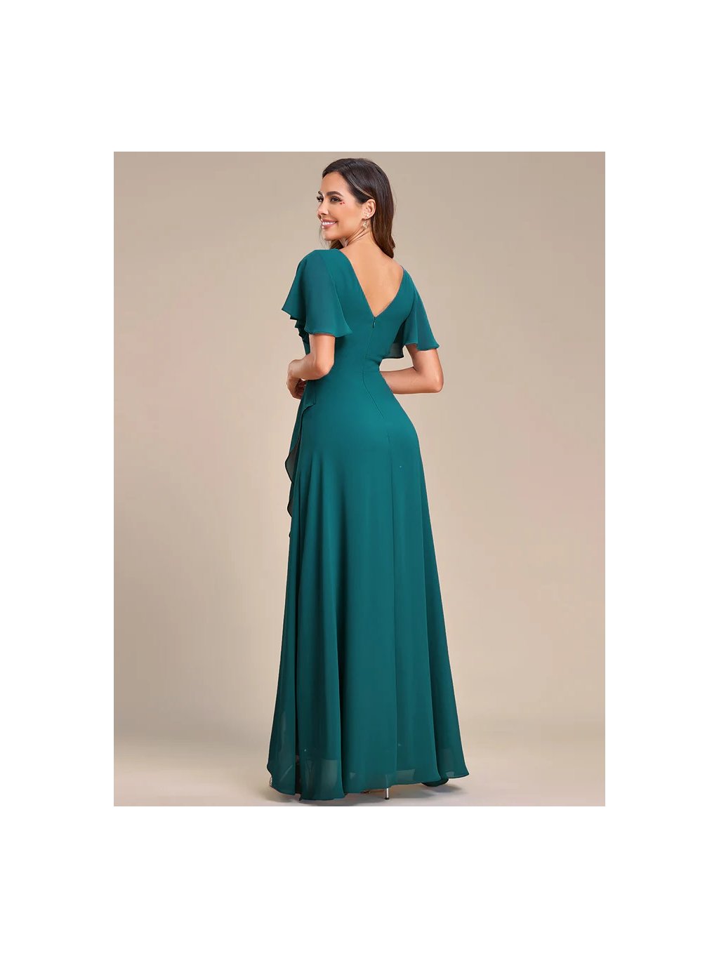 Jemné šifonové šaty s krátkými rukávy, dokonalý jednoduchý design. Šaty mají midi délku a asymetrickou sukni, ideální pro svatební hosty či družičky.