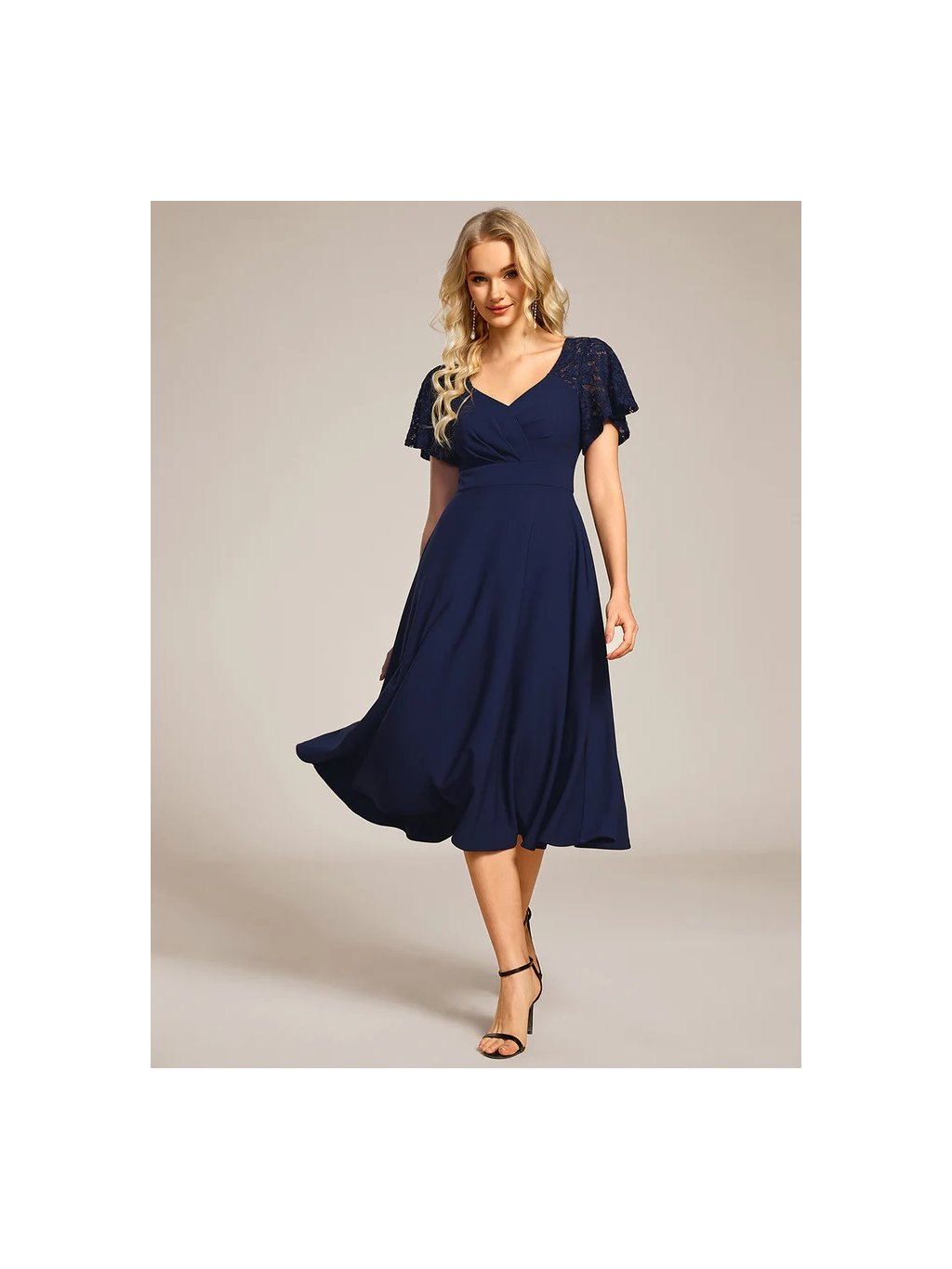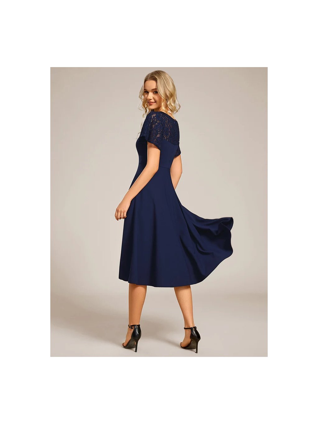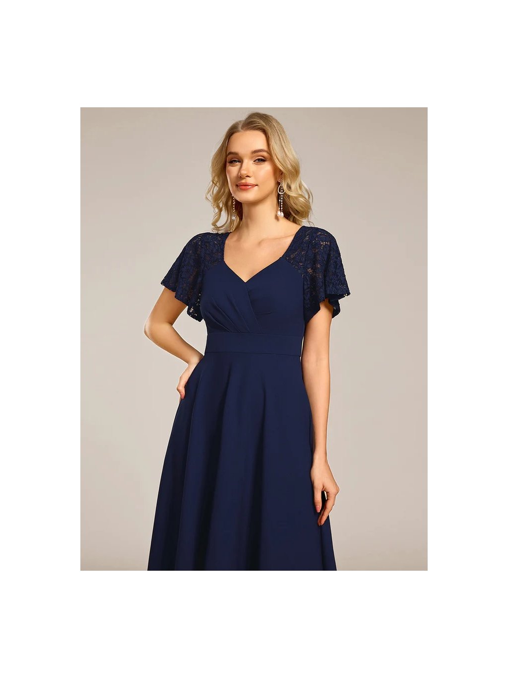 Společenské šaty strečové Ever Pretty. Šaty mají krátký krajkový rukáv, na prsou mají velký výstřih. Sukně je bohatá,
