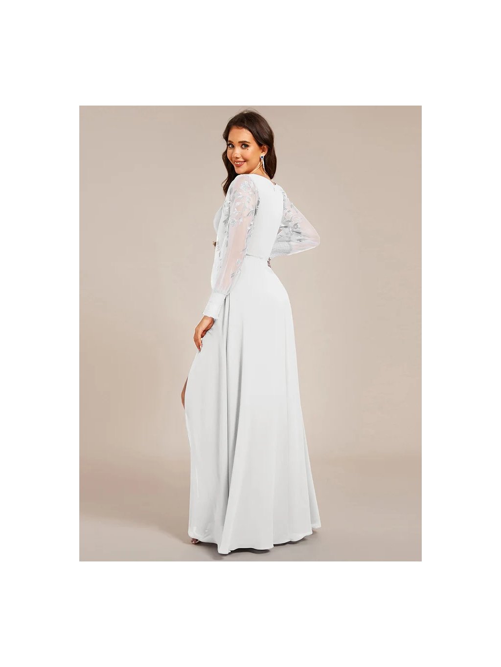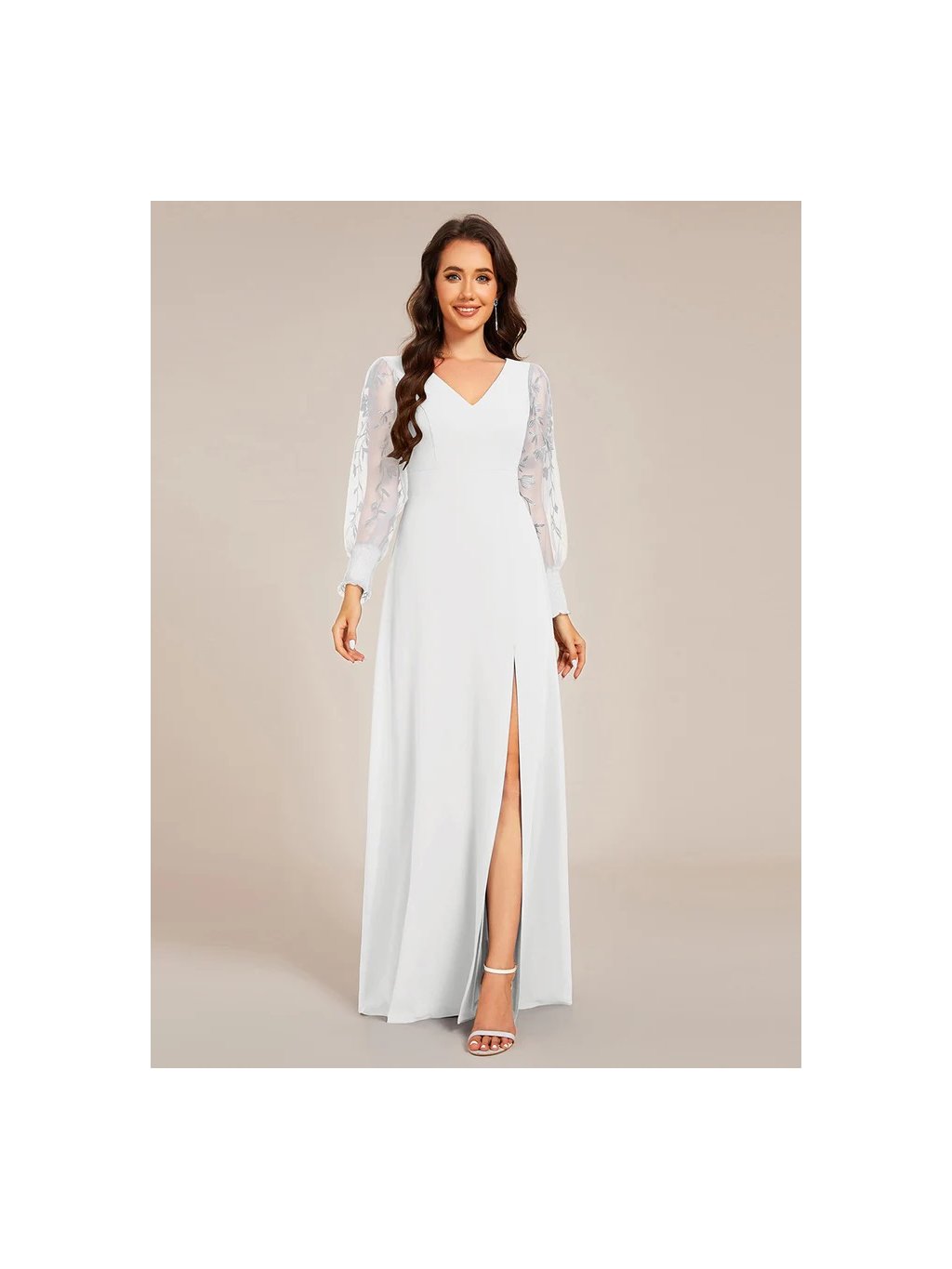 Úchvatné plesové šaty Ever Pretty. Šaty mají dlouhé průhledné rukávy s výšivkou. Na prsou véčkový výstřih. Sukně má rozparek.