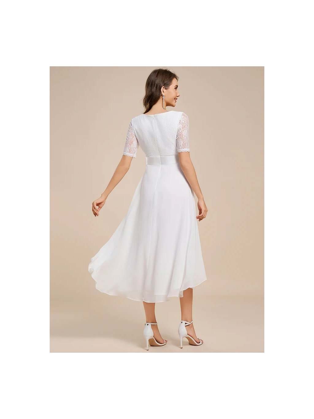 Šaty bílé střední délky s krátkými rukávy. V pase jsou skládané což jim dává zvláštní tvar.S výstřihem do V a v zadu zapínání až ke krku.vršek je vyšívaný