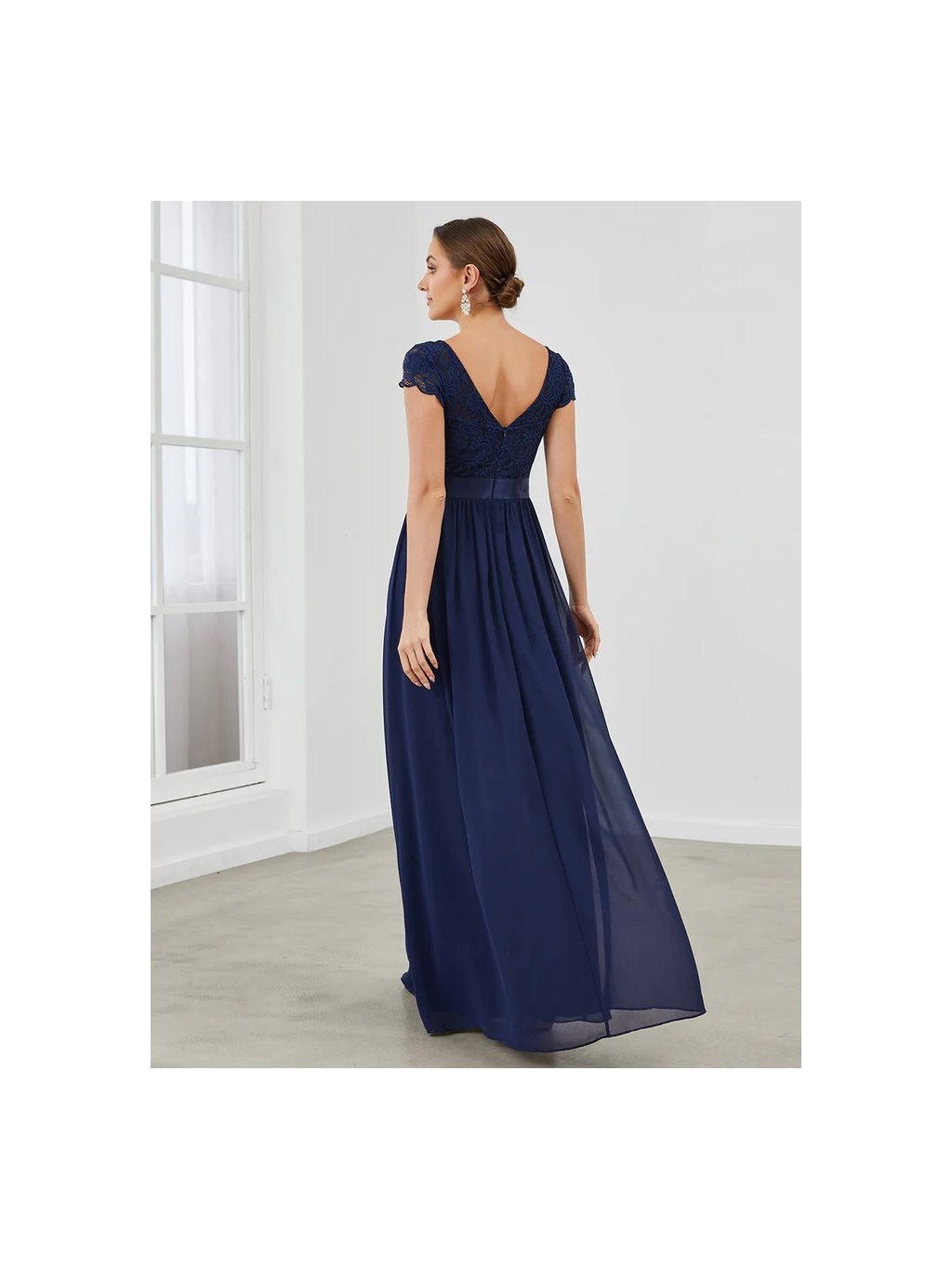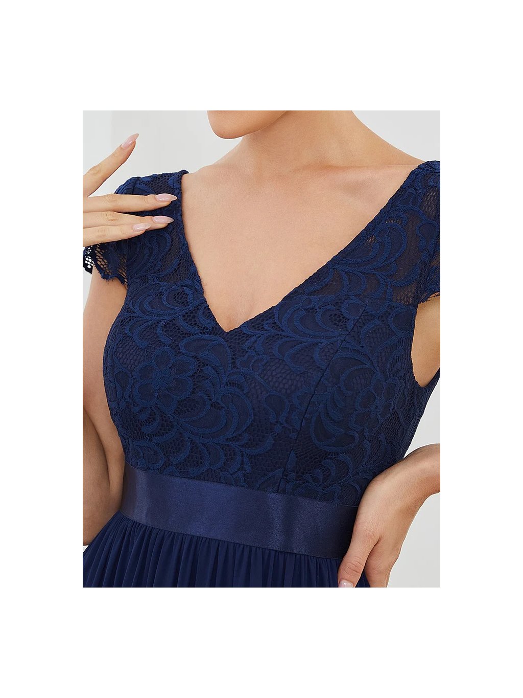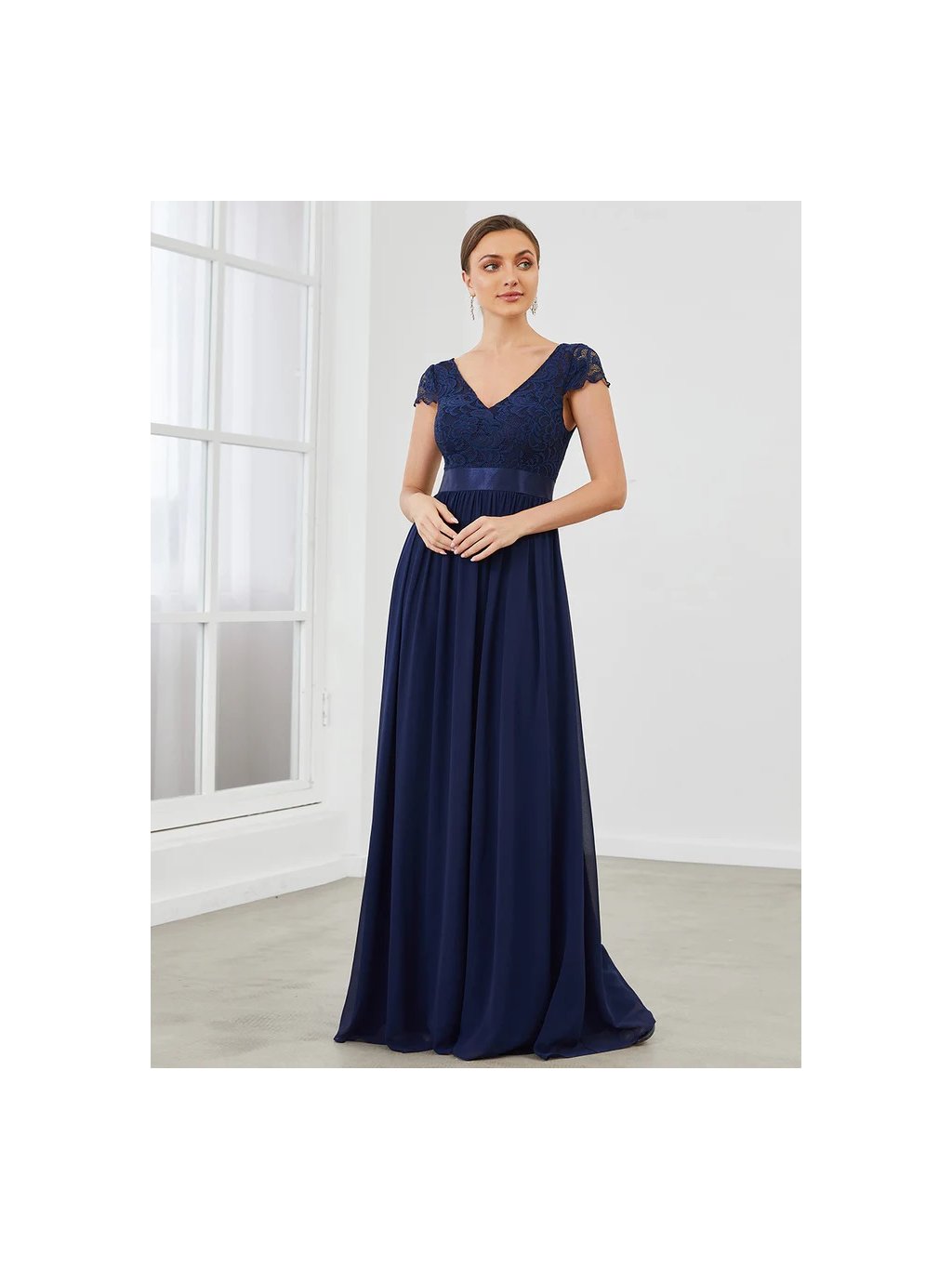 Nádherné modré šaty Ever Pretty. Dlouhé šaty na široká ramínka. Na prsou kulatý výstřih a na zádech mají velký výstřih a vrchní díl je zdobený krajkou s květy.