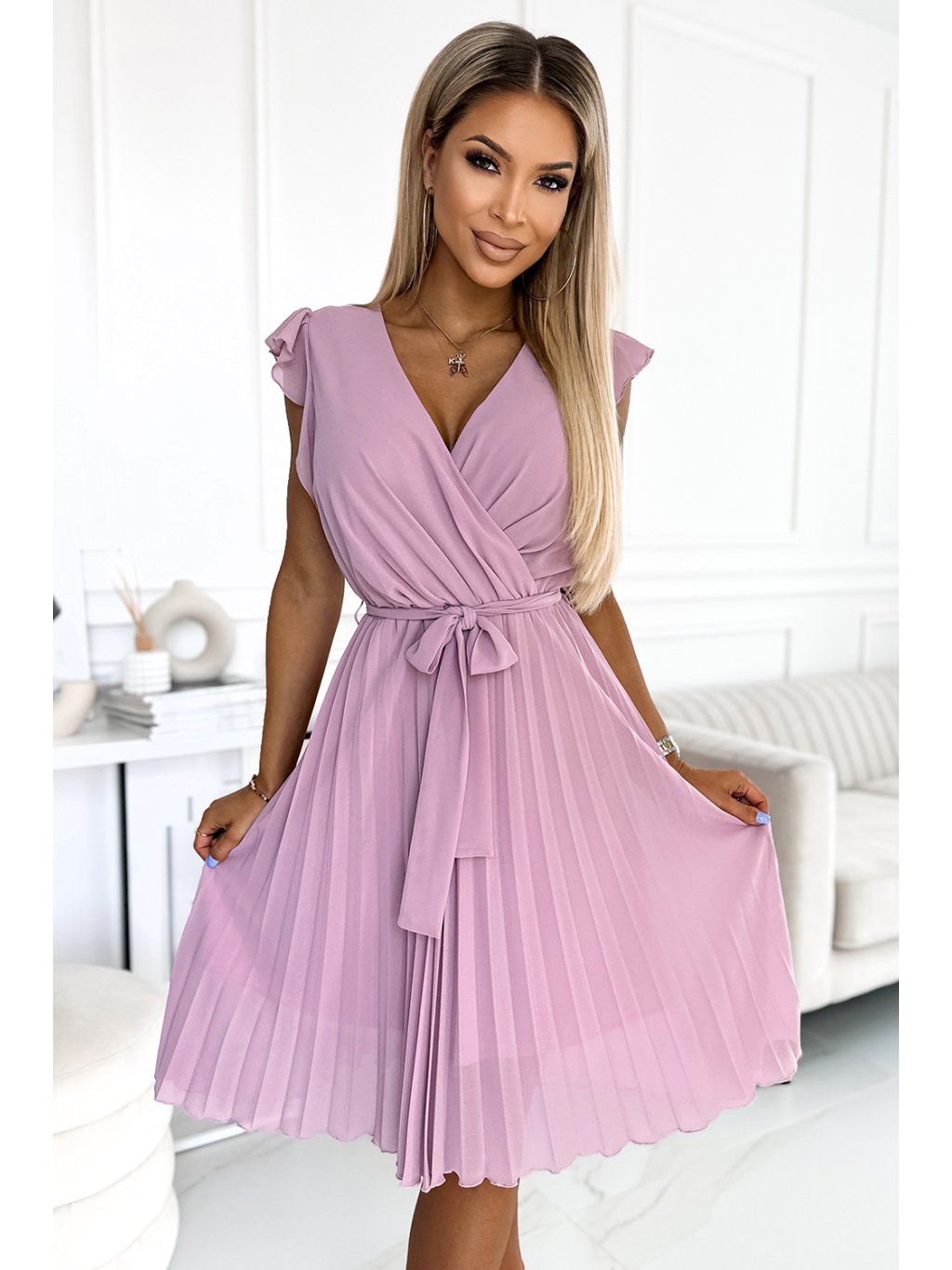 Šifonové šaty s výstřihem a volánky na ramenou. Šaty v barvě špinavě růžové. Značka numoco. Polská výroba.