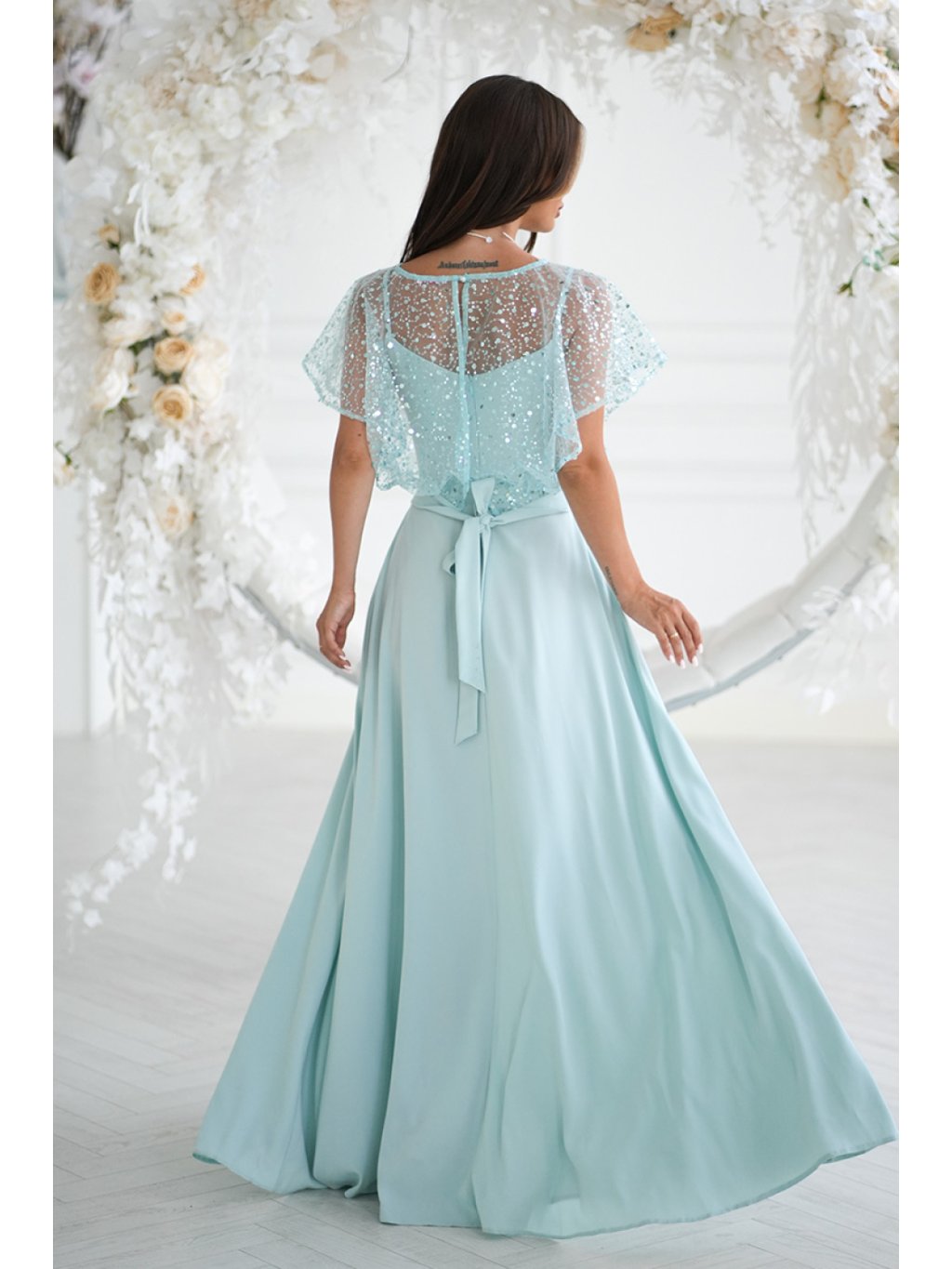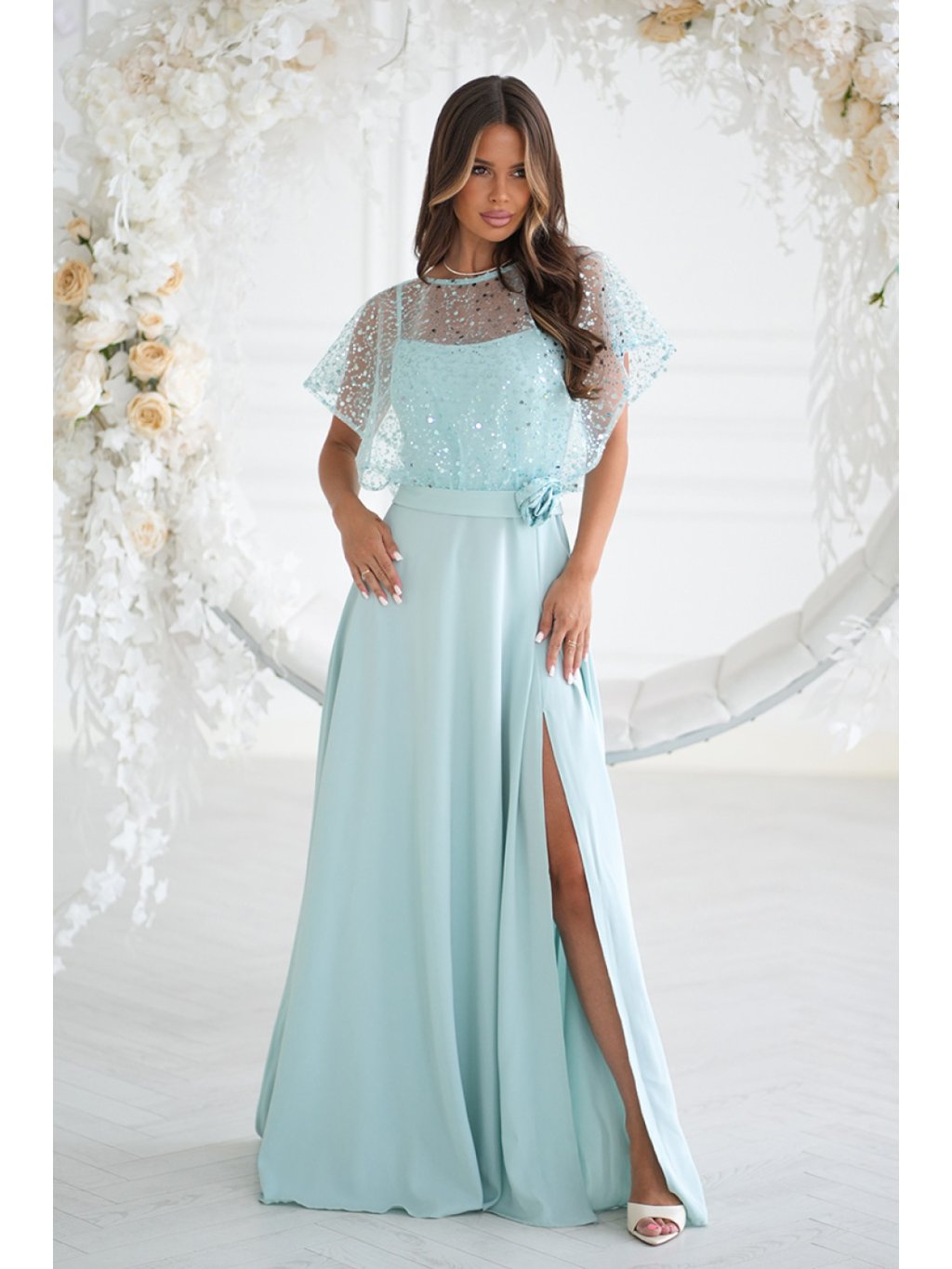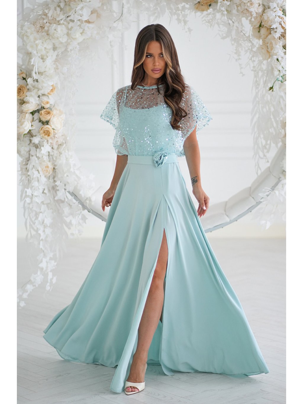 Elegantní šaty na tenkých ramínkách, vyrobené z lehkého materiálu, doplněné lesklým cekínovým bolerem s růží na pásku. Lesklé provedení dodává stylizaci eleganci a lesk, čímž se stávají ideální volbou pro večerní vycházky a speciální události. Šaty se zapínají na skrytý zip, co usnadňuje oblékání a svlékání kreace.