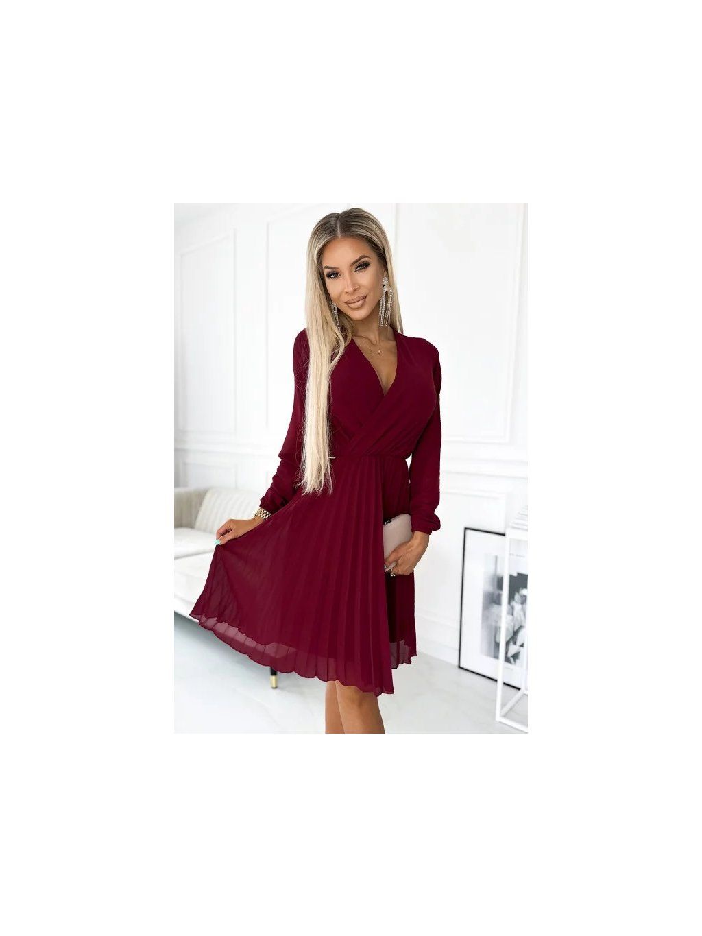 Ženské šaty s obálkovým výstřihem, a elastickými rukávy. Šaty ve vínové barvě. skládaná sukně .Polská produkce. Značka numoco.