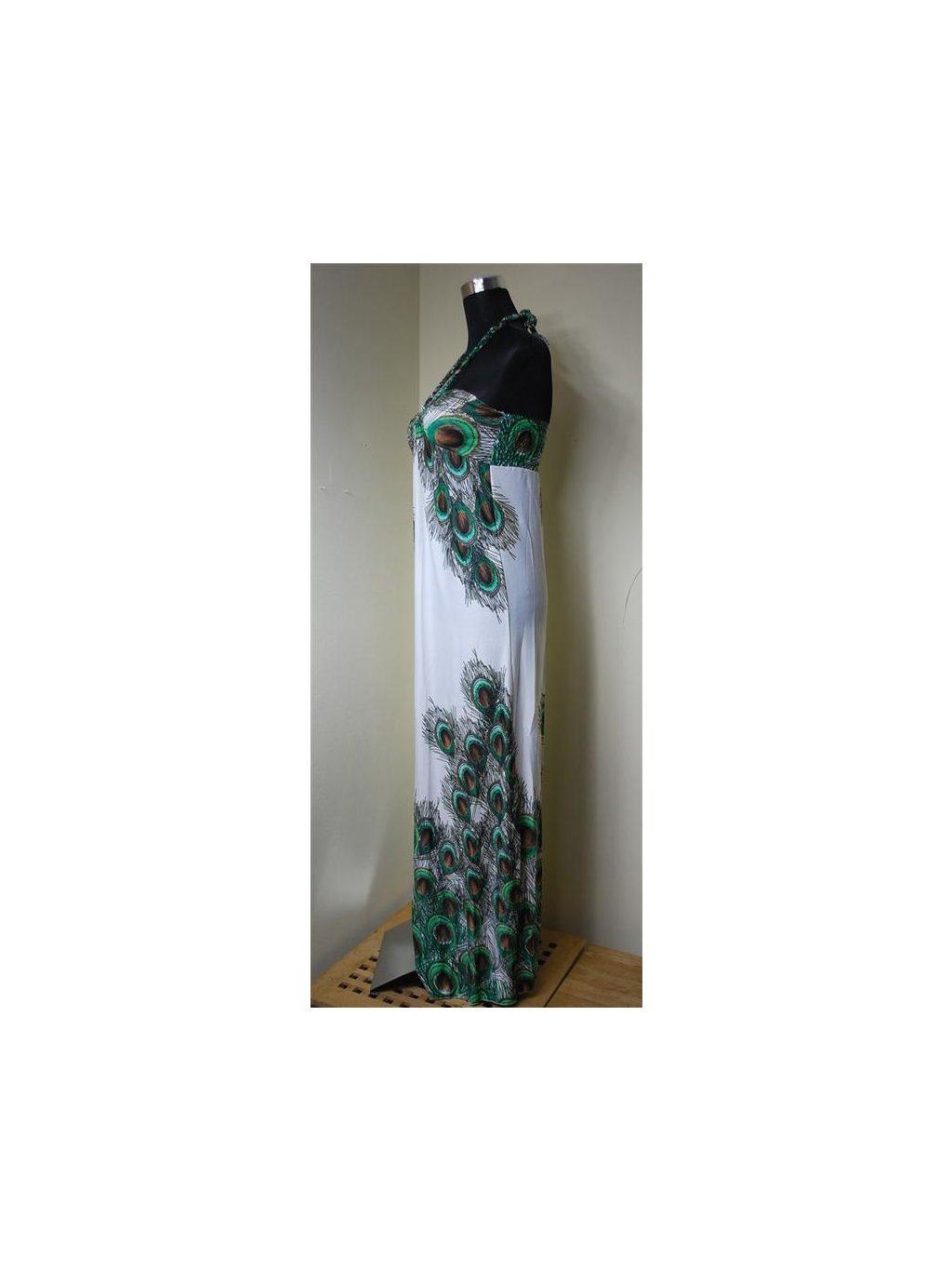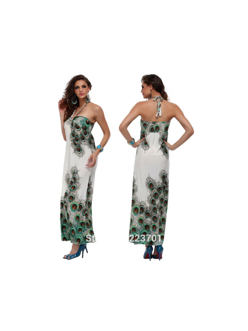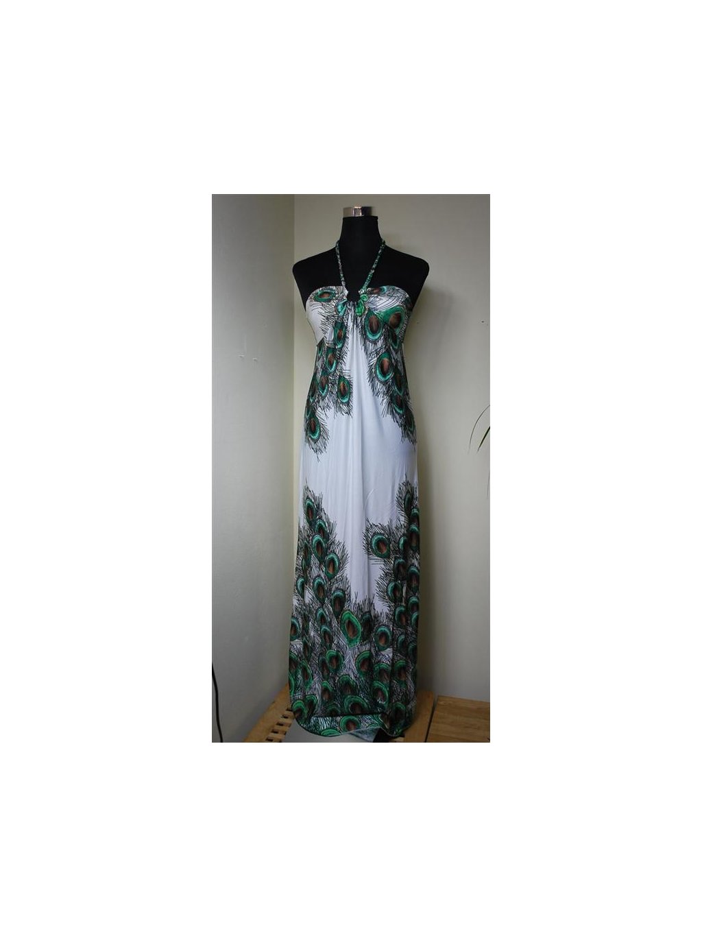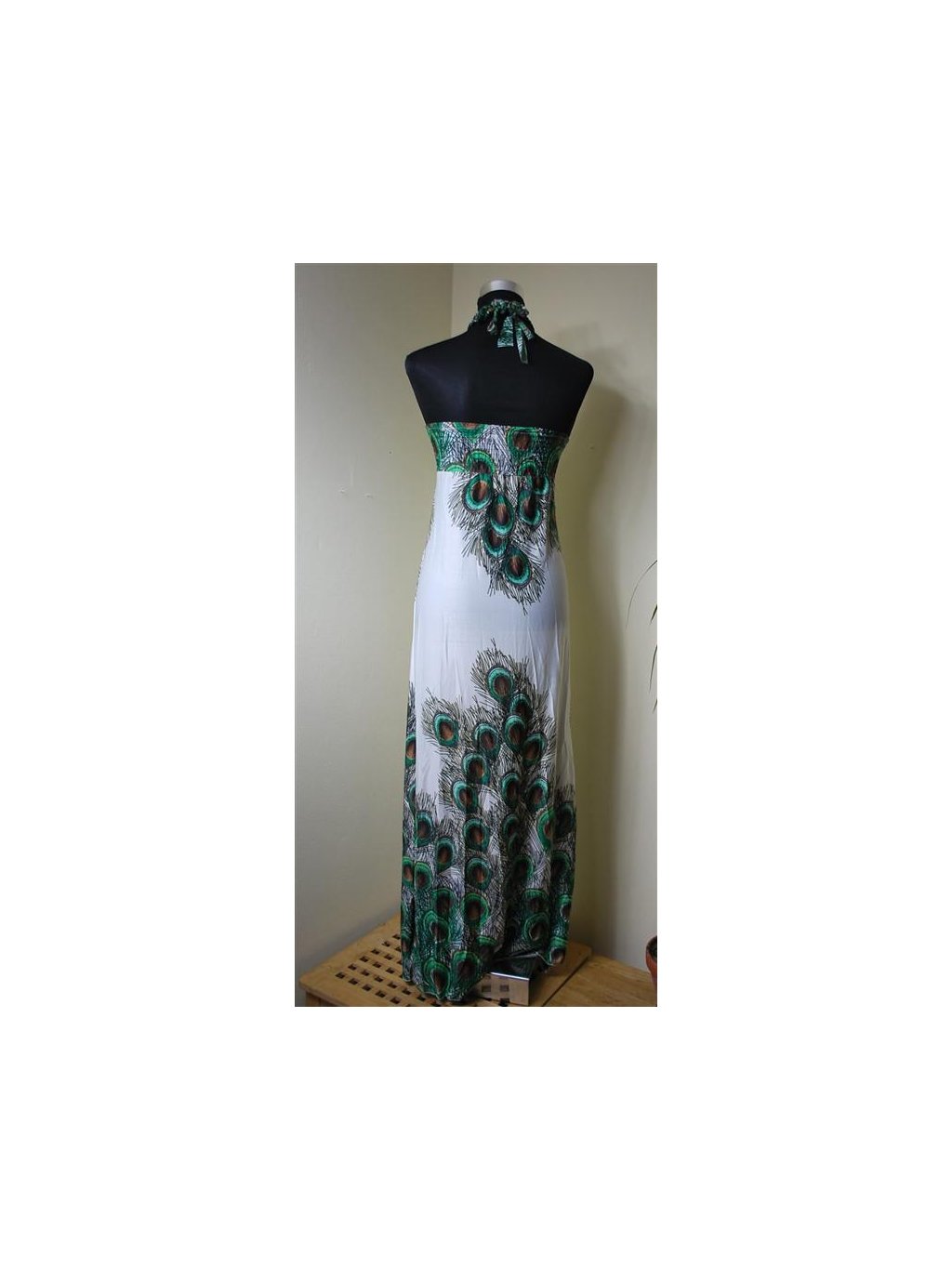 Dámské šatičky dlouhé - motivy paví Buďte sexy s těmito originálními šatičkami budete elegantní v každé situaci. Velmi příjemný, jemný materiál, krásně se nosí. Na zavazování za krk, mezi prsy je kovová spojka. Vzadu jsou šatičky v oblasti prsou nařasené gumičkou, která Vám krásně udrží šaty na místě a přizpůsobí se Vaší postavě. Šatičky mají vycpávky na prsou. Rozměry S/M (cca, neroztažené - roztažené): celková délka(od prsou): 120cm přes prsa: 60-80cm v pase: 90cm složení: 100% POLYESTERDoplňkové parametry