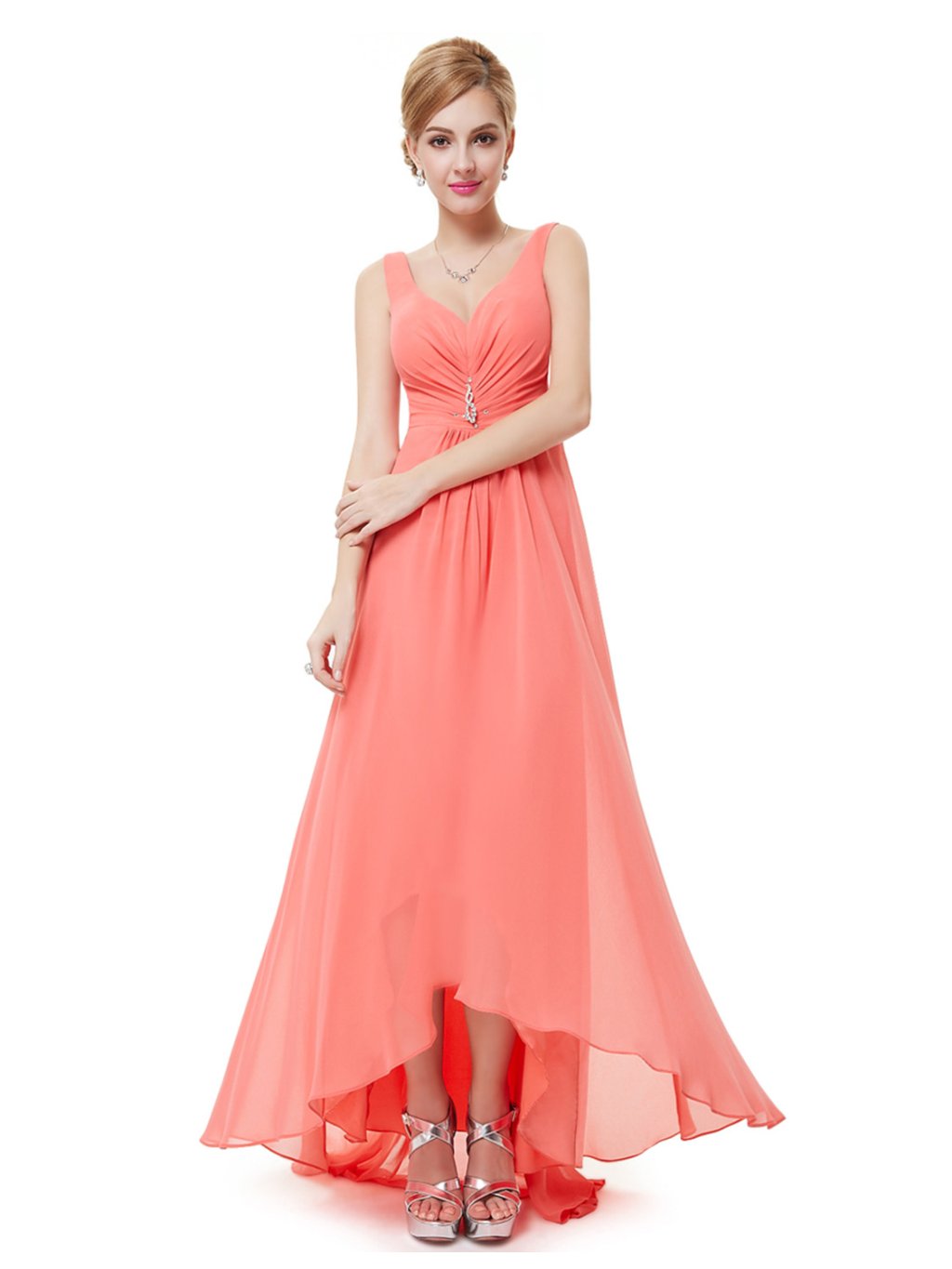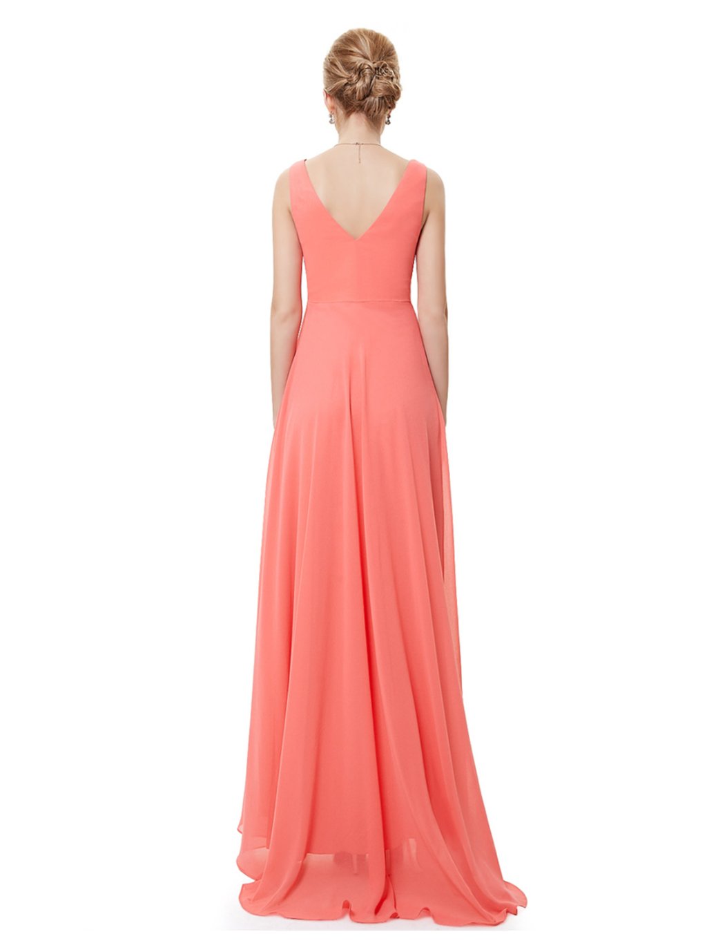 Lososové šifonové šaty bez rukávů, vloženy vycpávky, lze nosit bez podprsenky. Vhodné do tanečních.