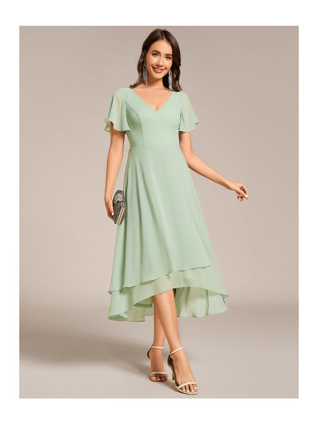 Jemné šifonové šaty s krátkými rukávy, dokonalý jednoduchý design. Šaty mají midi délku a asymetrickou sukni, ideální pro svatební hosty či družičky.