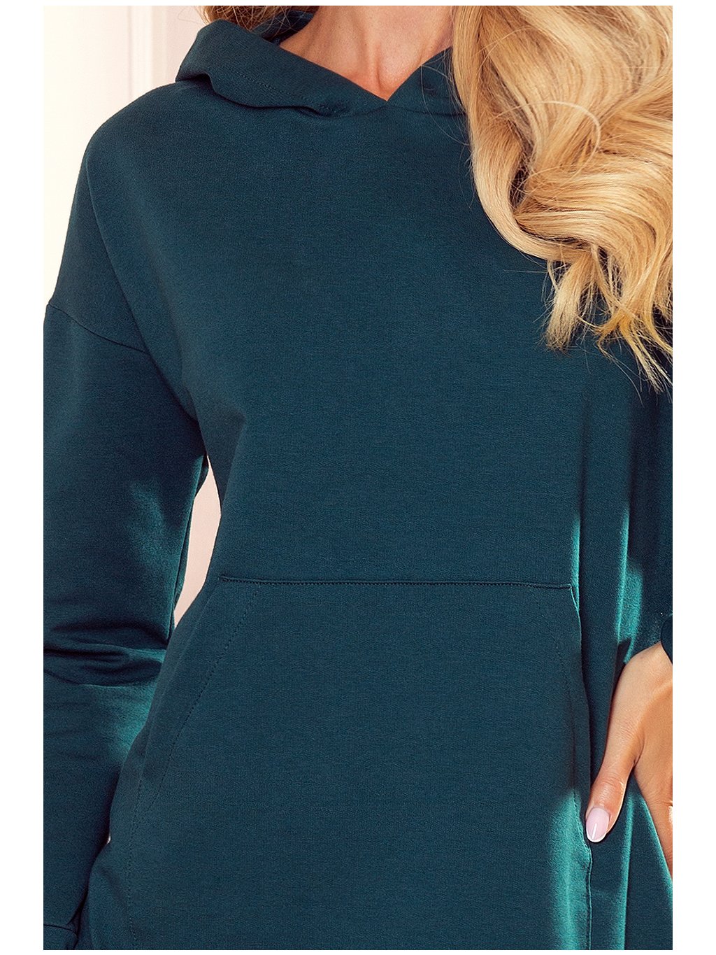Šaty jsou s dlouhým rukávem na zádech s kapucí,klokaní kapsa a volný střih