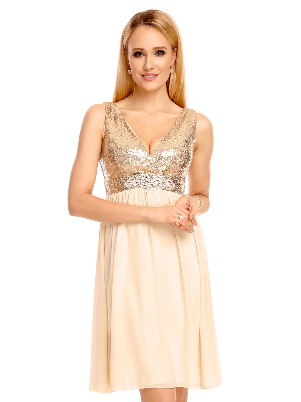 Jemné a romantické šaty béžové barvy. Šaty mají velký výstřih, celý vrchní díl je zdobený flitry zlaté barvy. Na zádech mají skrytý zip.
