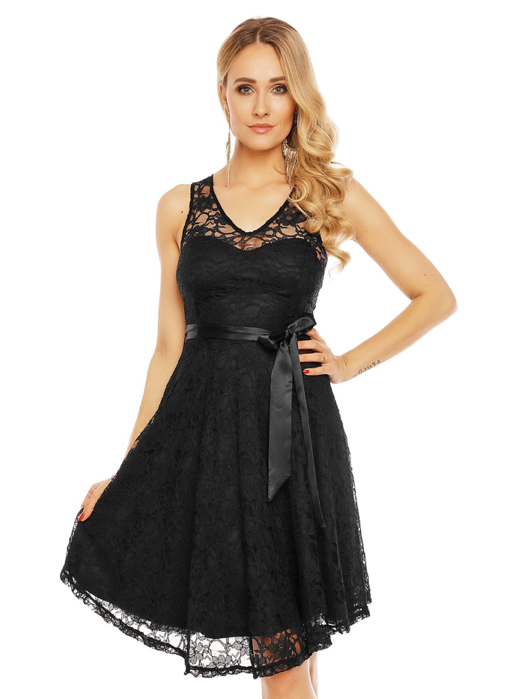 Jemné a romantické šaty černé barvy. Šatičky jsou celokrajkové, podšívku mají stejné barvy. Mají kulatý výstřih a široká ramínka. V pase jsou zdobeny stuhou. Šaty mají na zádech skrytý zip.