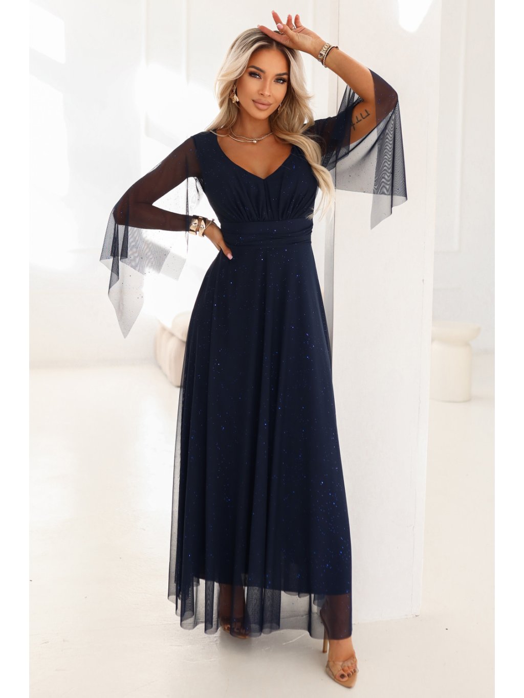 Temně modré maxi šaty s brokátovým leskem od Numoco Basic jsou elegantní volbou pro ženy, které hledají šaty na svatbu, ples nebo maturitní ples. Model byl navržen tak, aby krásně zdůrazňoval postavu, a to jak ve standardních velikostech, tak i ve velikostech plus size, a proto se skvěle hodí pro ženy, které chtějí vypadat štíhle a zároveň cítit plnou volnost pohybu. Lehce lesklý materiál s jemným brokátem vytváří efekt hvězdného záření, který se krásně prezentuje ve večerním světle. Klopený V výstřih zužuje krk a opticky modeluje horní část postavy, a široký, stabilní pás v pasu dodává postavě proporce. To je zvláště důležité pro ženy hledající večerní šaty plus size, které skutečně zlepšují linii pasu. Vzdušné motýlové rukávy jemně obklopují ramena a dodávají lehkost celému outfitu. Spod šatů je rozklosovaný a krásně pracuje při chůzi a tanci, díky čemuž se model ideálně hodí na celonoční oslavy. Temně modrá barva působí zeštíhlujícím dojmem a je jedním z nejoblíbenějších odstínů pro svatbu, maturitní ples a elegantní přijetí. Pokud hledáte temně modré maxi šaty na svatbu, večerní kreaci ve velikosti plus size nebo elegantní šaty na karneval, které zdůrazňují pas a maskují drobné nedokonalosti, tento model splní všechna tato očekávání. Objevte šaty, které spojují eleganci, pohodlí a efekt zeštíhlení ideální jak na výjimečné události, tak jako spolehlivou kreaci pro ženy plus size.