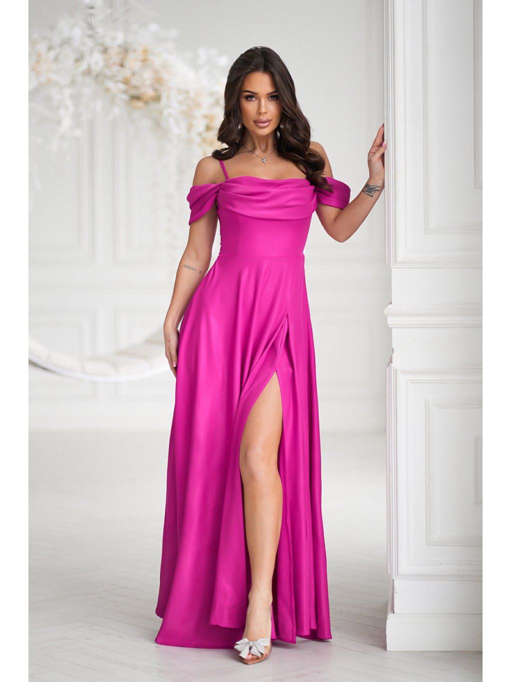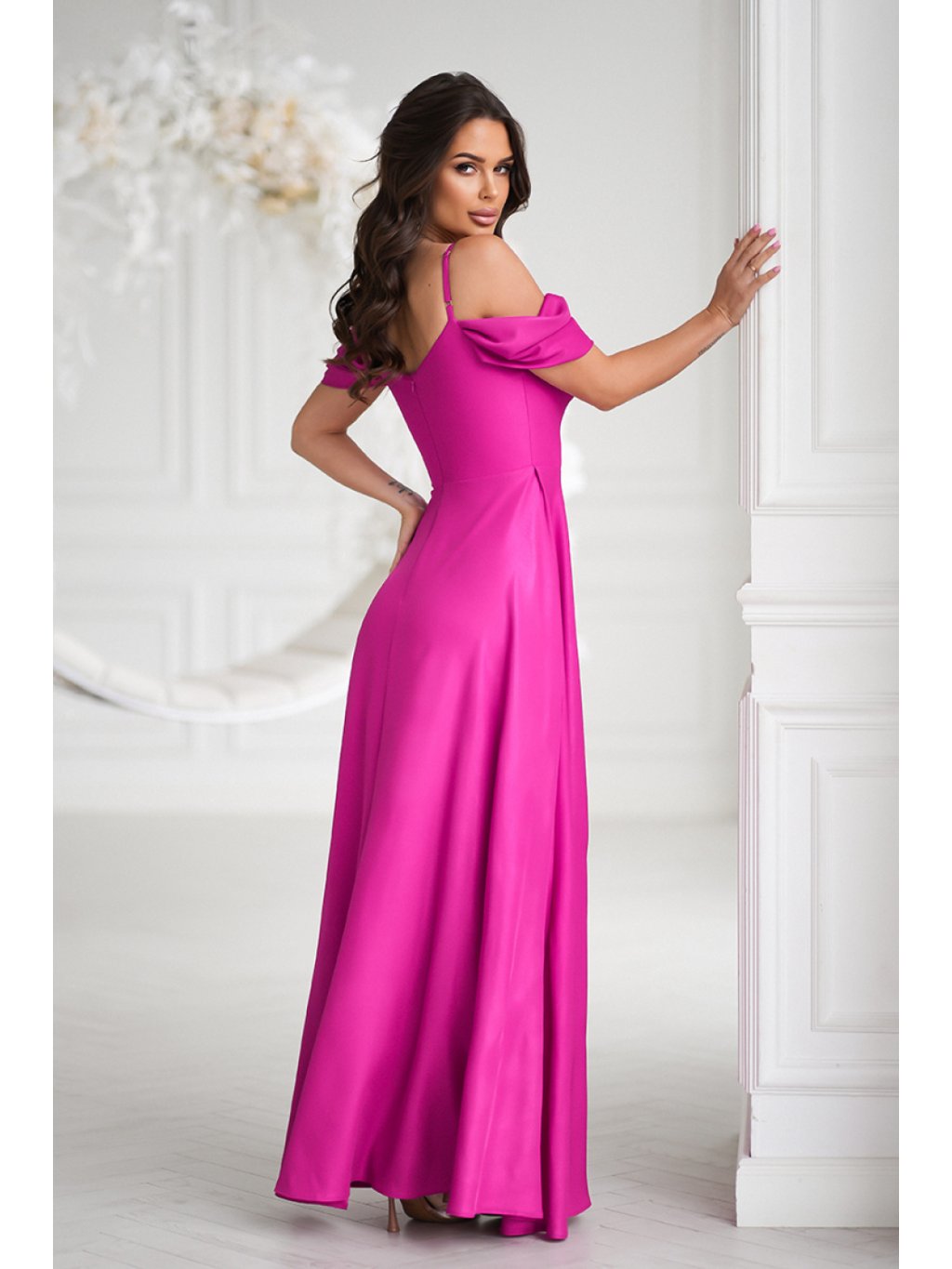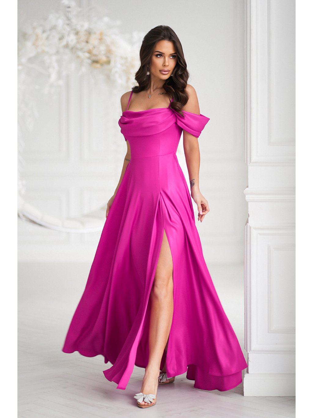 Přizpůsobený vrch zdůrazňuje pas a dlouhá, vzdušná sukně opticky způsobuje, že postava vypadá štíhleji. Efektní rozřezání přidává lehkost a volnost pohybu. Vyrobeno z měkkého, lesklého materiálu, který jemně září každým krokem. Šaty se zapínají na skrytý zip a mají podšívku. Ideální na speciální příležitosti, spojuje eleganci a pohodlí.
