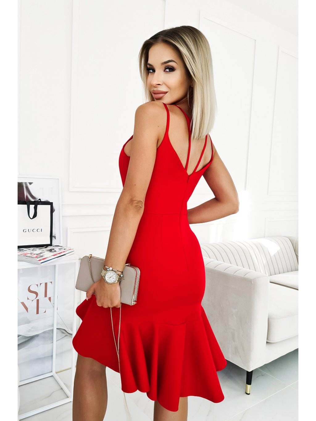 Velmi dívčí šaty s tenkými ramínky. Spodní část je vzadu mírně prodloužená krásným volánkem, který dodává celému stvoření vzdušnost. Top se přizpůsobí, jemně odhaluje poprsí. Šaty se zapínají na krytý zip. K dispozici v jarních barvách.