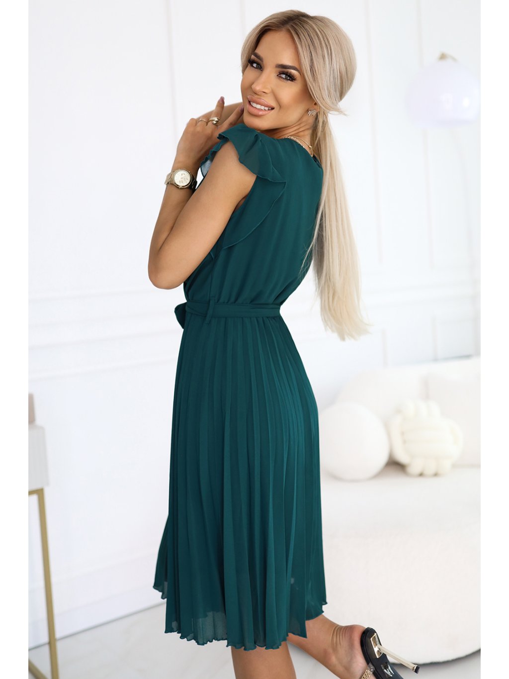 Oslnivé šaty v barvě lahve zelené spojují eleganci a pohodlí. Model s překrytým výstřihem krásně zdůrazňuje poprsí a krk, a jemné volány na ramenou přidávají ženské kouzlo. Šifonová sukně se volně skládá v pohybu, vytvářejíc lehký a vzdušný efekt, ideální na svatbu, rodinné oslavy, rande nebo koktejlovou party. Pas je zdůrazněn vázáním pásku, který lze přizpůsobit postavě.