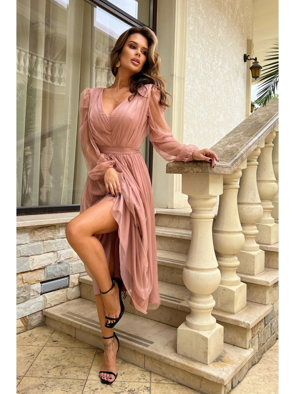 Midi šaty s mírně rozšířenou vrstvenou sukní zdobenou brokátovou síťovinou. Vrchní část kreace je nařasená s dlouhými rukávy zakončenými gumičkou. Rukávy jsou vyrobeny ze stejné síťoviny jako zbytek šatů. Výstřih a záda ze serpentin. Šaty se zapínají na krytý zip a mají podšívku. Model dodává šatům eleganci a ženskost.