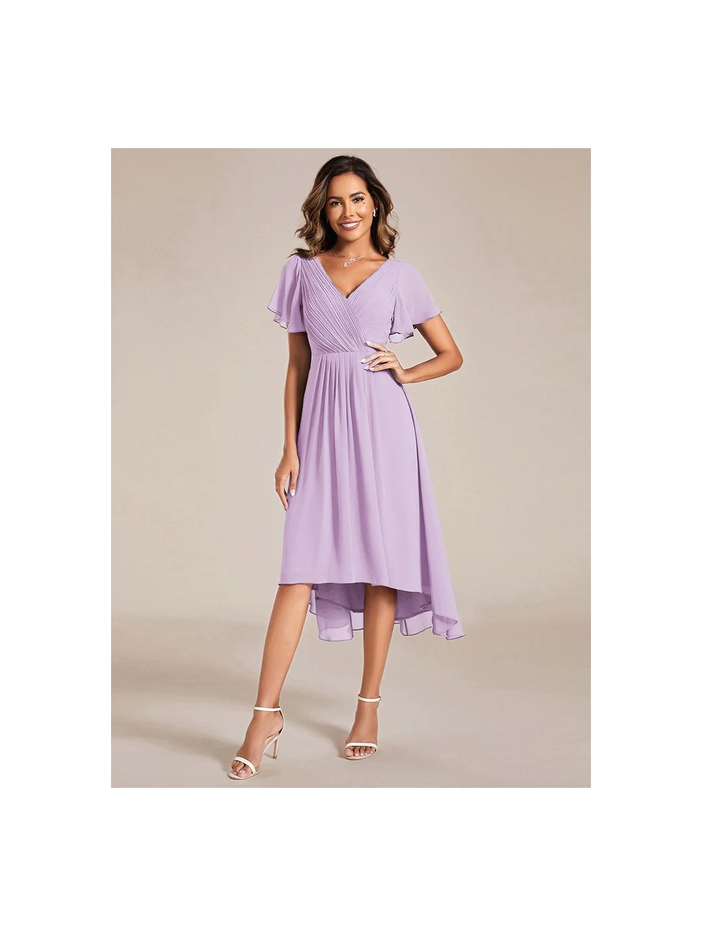 Jemné šifonové šaty s krátkými rukávy, dokonalý jednoduchý design. Šaty mají midi délku a asymetrickou sukni, ideální pro svatební hosty či družičky.