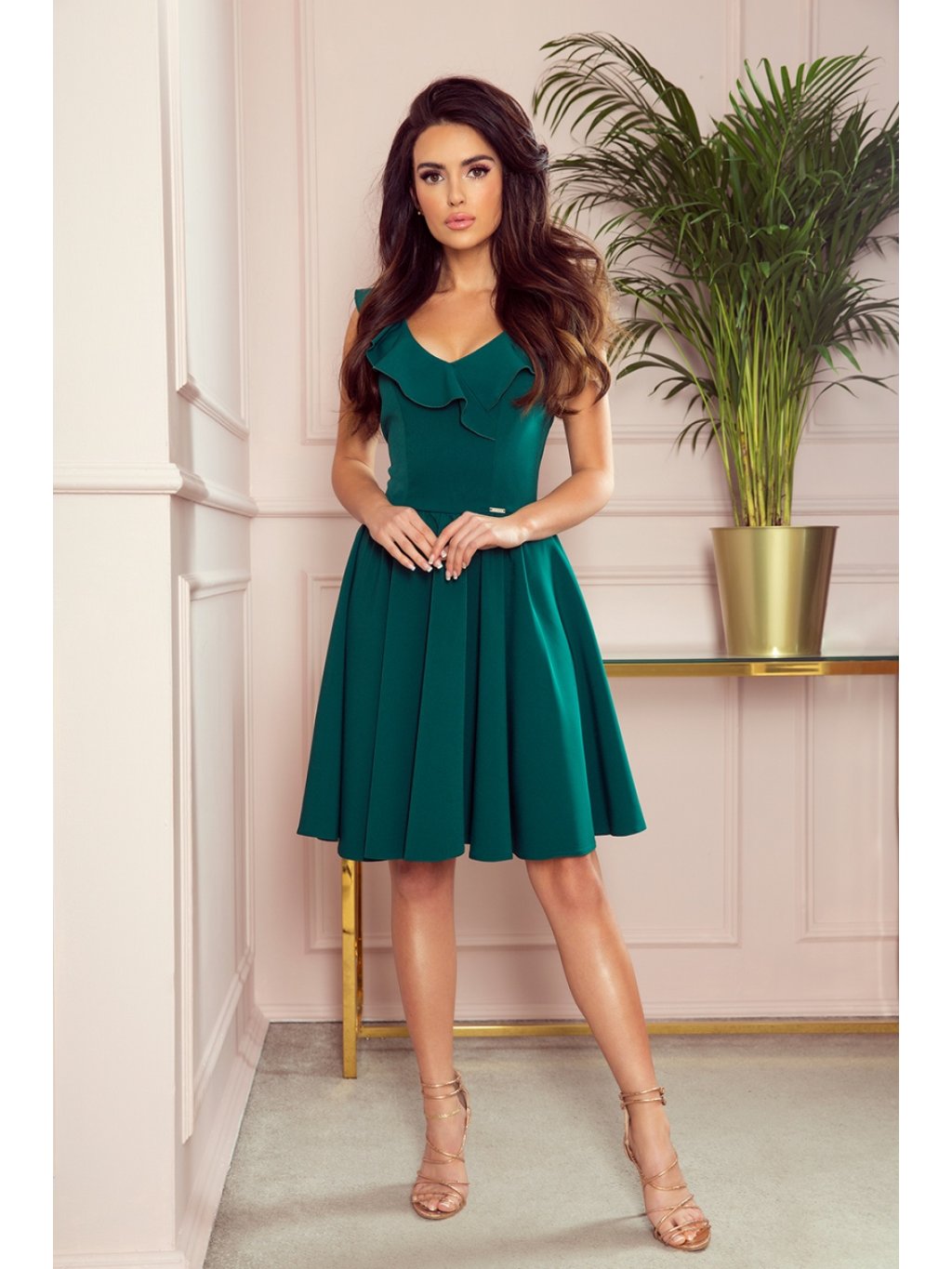 Šaty s volánky ve výstřihu a rozšířenou sukní. Barva: lahvově zelená. Značka numoco. Vyrobeno v Polsku.