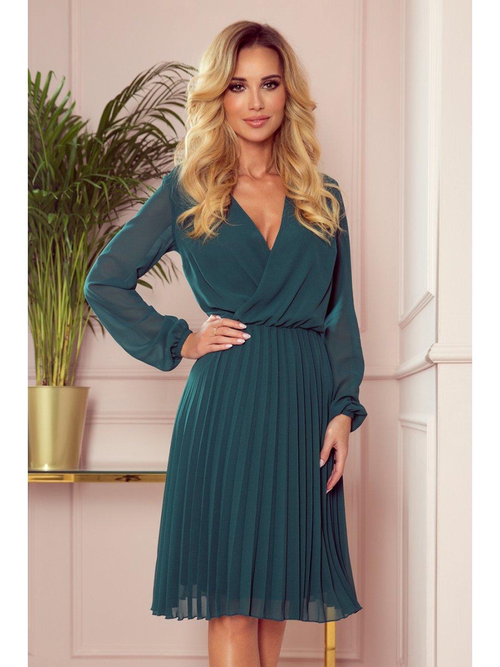Plisované šifonové šaty s výstřihem a dlouhými rukávy. Šaty v lahvově zelené barvě. Značka numoco. Vyrobeno v Polsku.