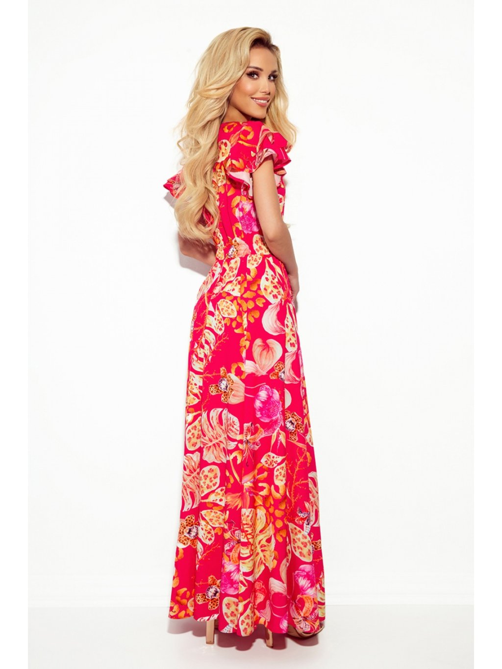 Dlouhé šaty s výstřihem a volánky na ramenou. Šaty v růžové barvě s květy a listy. Značka numoco. Vyrobeno v Polsku.