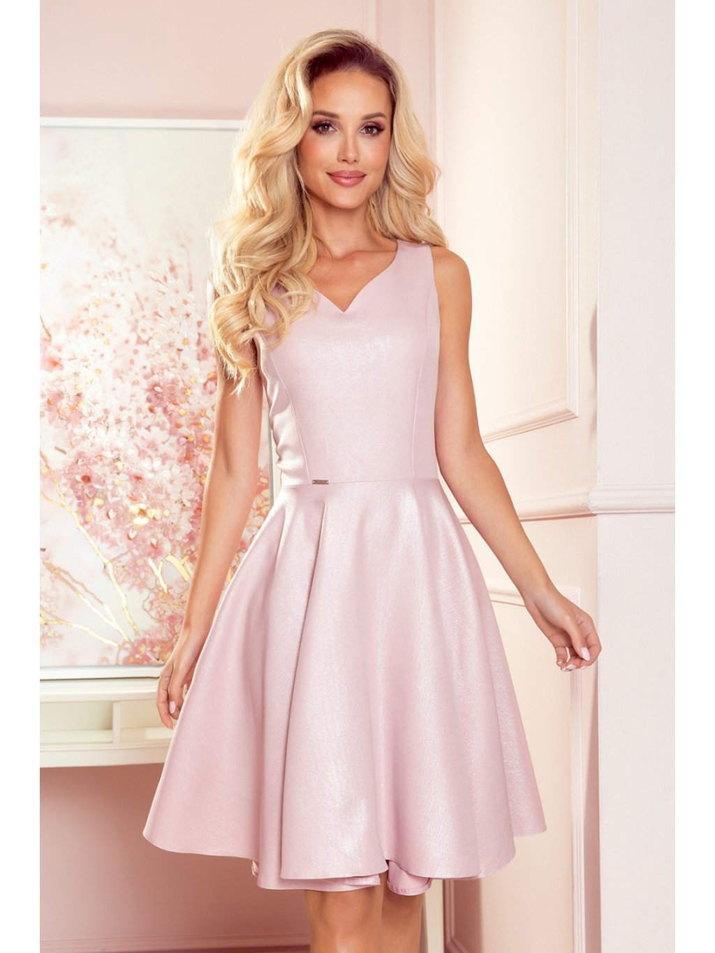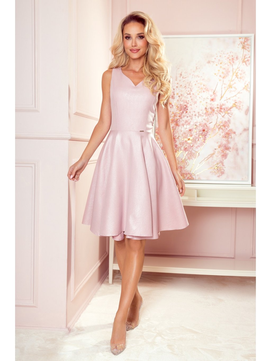 Rozšířené šaty s výstřihem ve tvaru srdce. Šaty v pudrově růžové barvě se třpytkami. Vysoce kvalitní tkanina s příjemným omakem. Značka numoco. Polský výrobek.