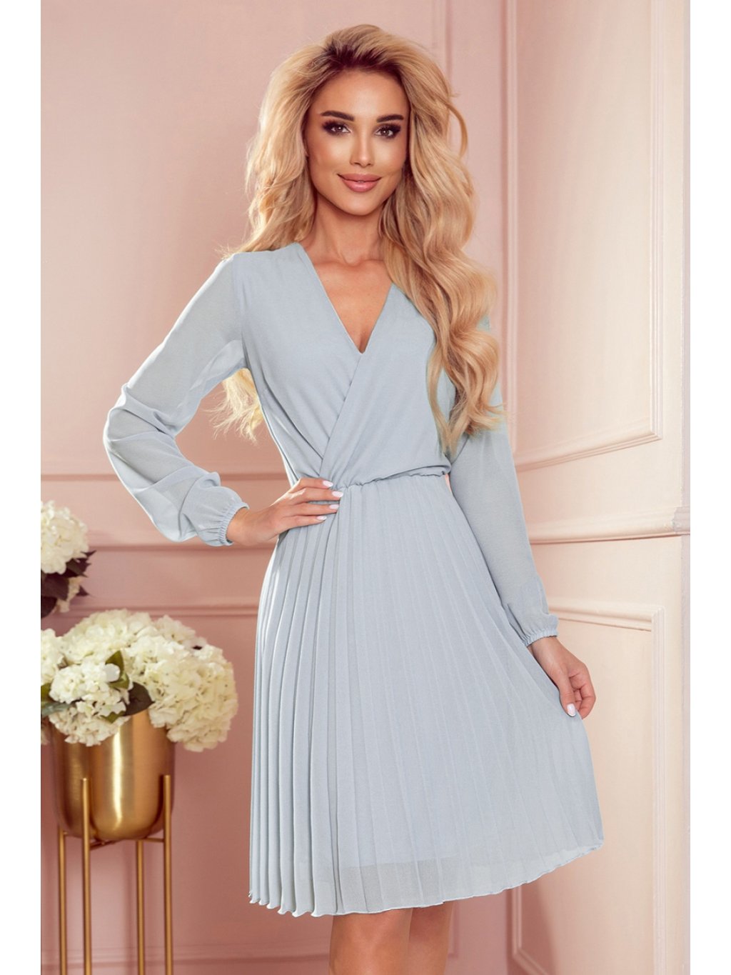 Plisované šifonové šaty s výstřihem a dlouhými rukávy. Šaty v šedé barvě. Značka numoco. Polská produkce.