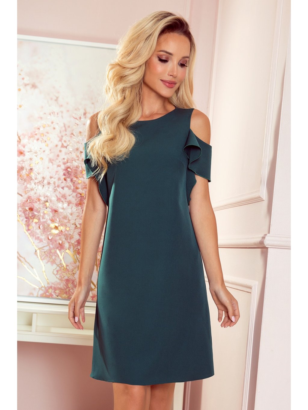 Trapézové šaty s volánky na rukávech a podšívce. Vyrobeno z tkaniny příjemné na dotek (95 % polyester, 5 % elastan). Šaty v lahvově zelené barvě. Značka numoco. Polská produkce.