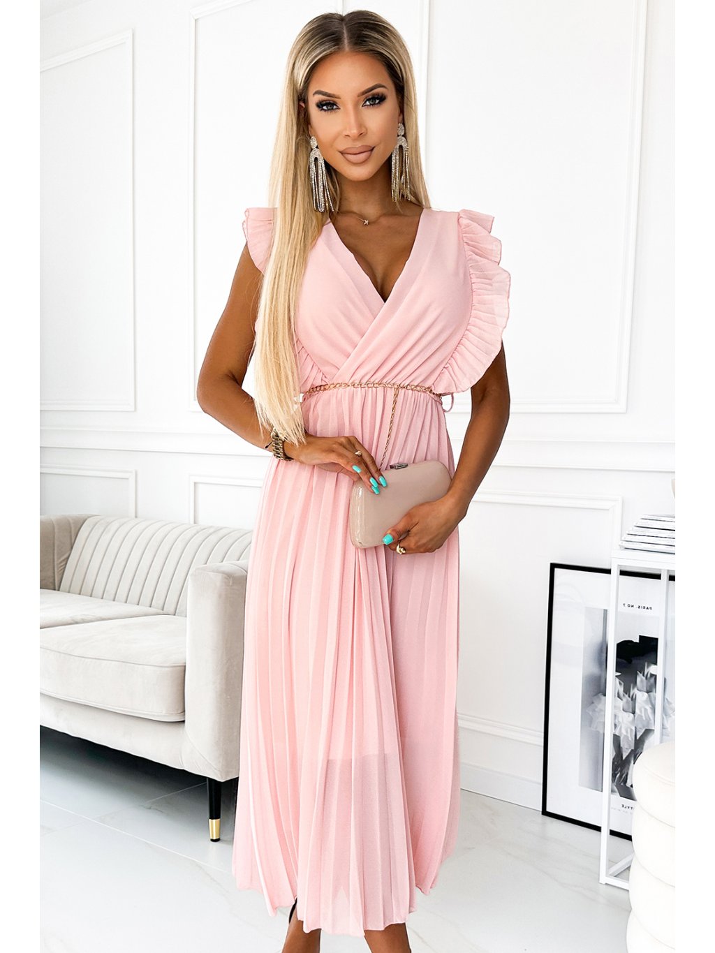 Plisované šifonové šaty s obálkovým výstřihem, volánky na ramenou a zlatým řetízkem. Broskvová barva. Značka numoco. Evropská výroba.