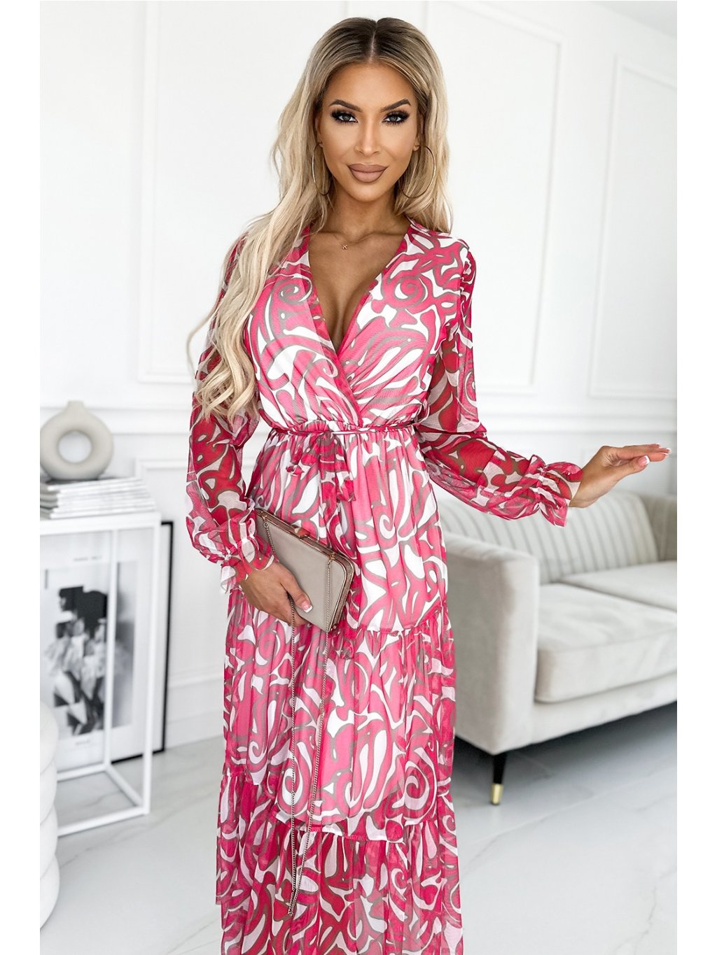 Šaty se třemi volánky, obálkovým výstřihem, dlouhými rukávy a páskem. Vyrobeno z elastické síťoviny na podšívce. Šaty z růžovo-bílé látky se vzorem vln. Značka numoco. Evropská výroba.Viskóza 95 %