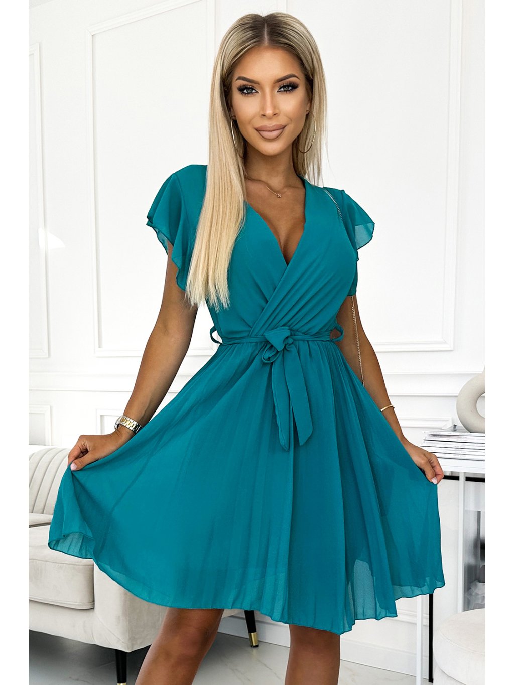 Šifonové plisované šaty se srdcovým výstřihem a volánky na ramenou. Šaty v barvě moře. Značka numoco. Evropská výroba.