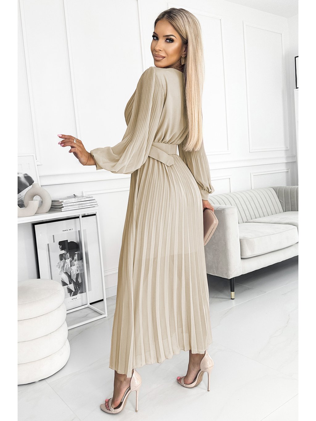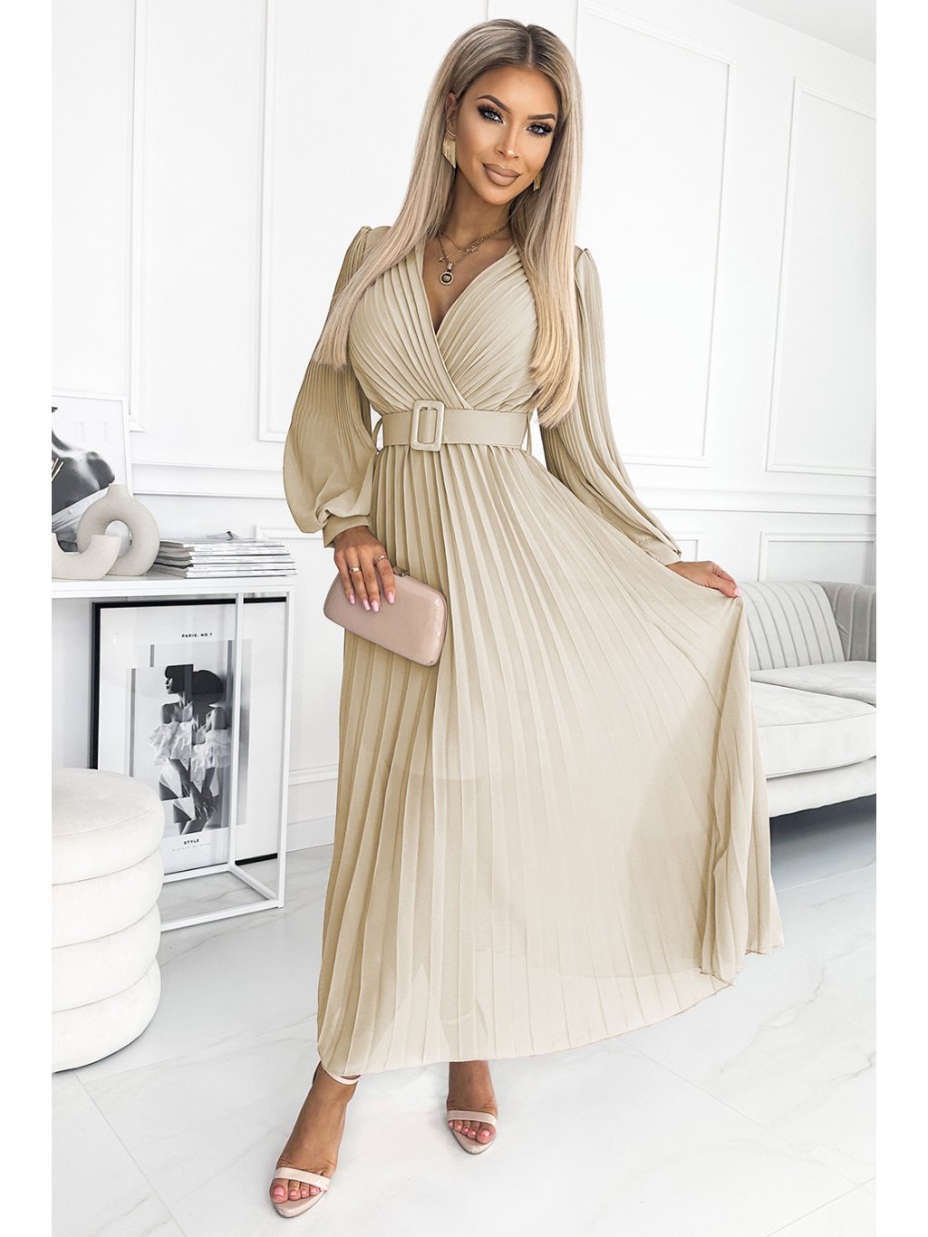 Plisované šifonové šaty s výstřihem, dlouhým rukávem a páskem. Plisování ve výstřihu a na rukávech dodává šatům eleganci. Šaty v béžové barvě. Značka numoco.