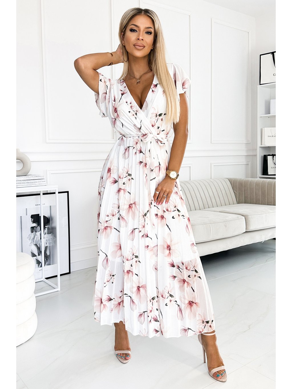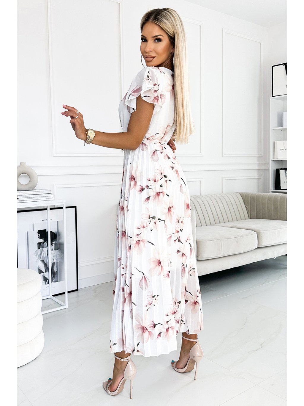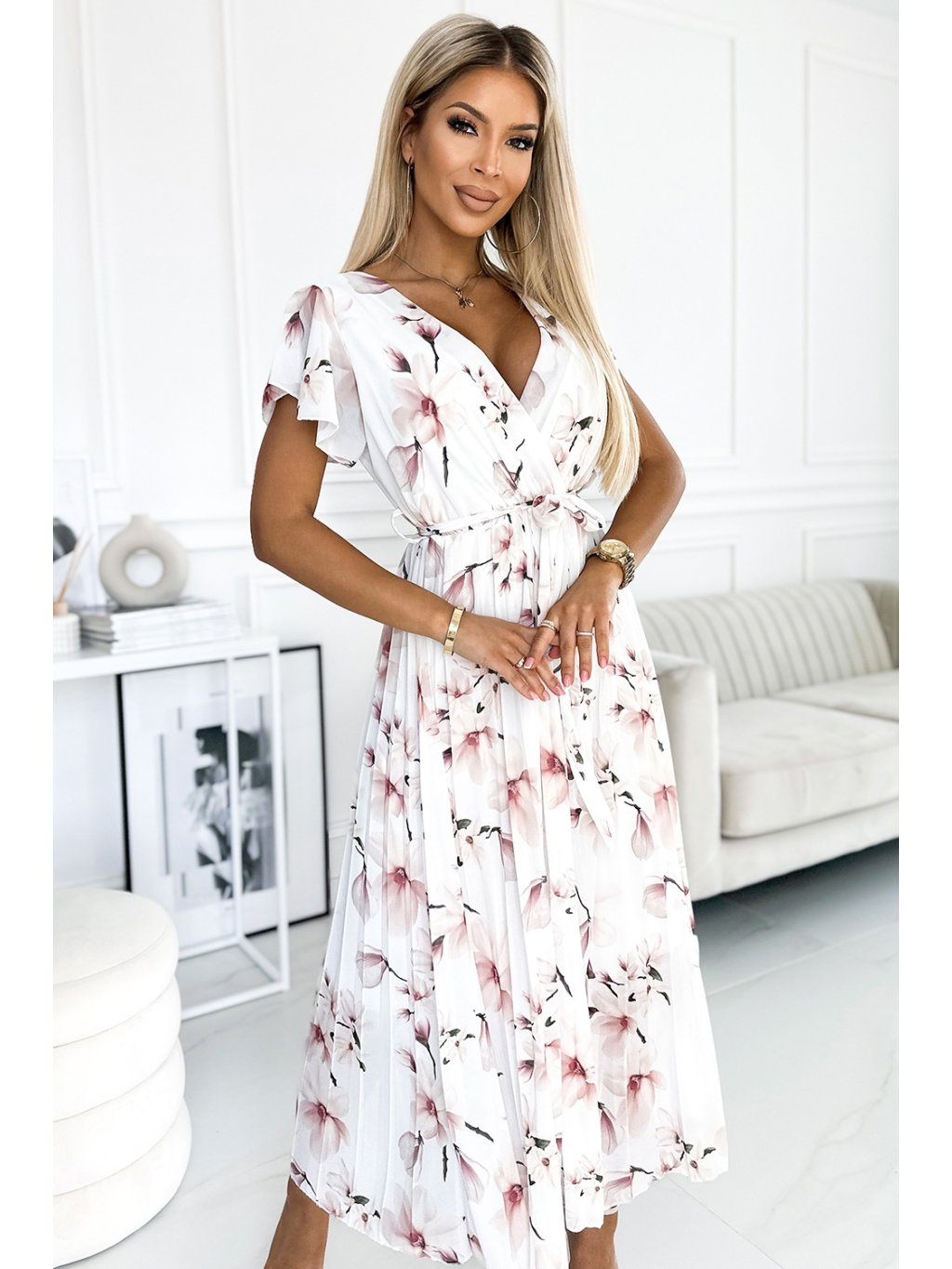 Šifonové midi šaty se srdíčkovým výstřihem a volánky na ramenou. Šaty z látky se vzorem broskvových květů na bílém pozadí. Značka numoco. Evropská výroba.