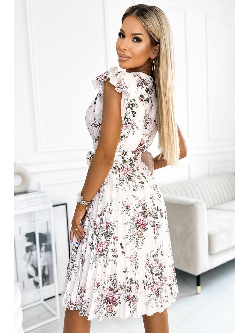 Plisované šaty s výstřihem, volánky na ramenou, páskem a podšívkou. Vyrobeno z vysoce kvalitní látky s polními květy. Značka numoco. Polská výroba.