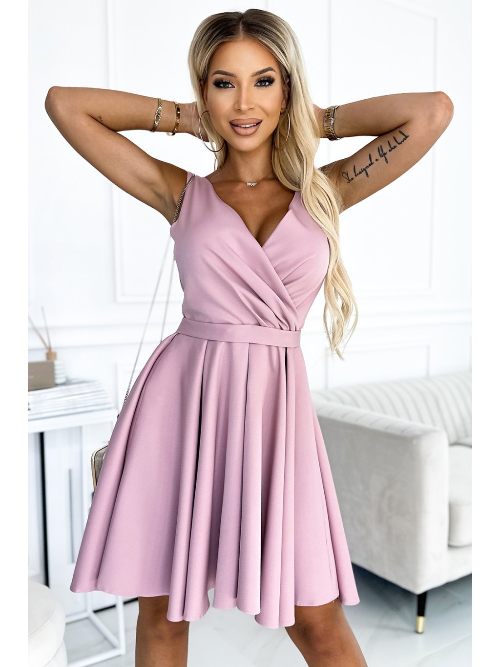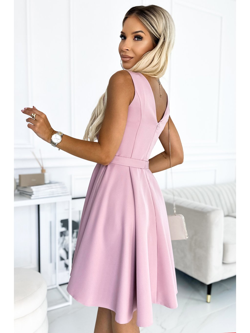 Asymetrické šaty s delšími zády, výstřihem a páskem. Šaty jsou vyrobeny z látky v barvě špinavě růžové. Sukně s delším zadním dílem bude ideální na tanec. Vyrobeno v Polsku. Značka Numoco.