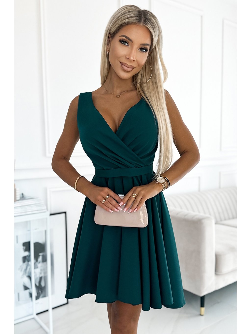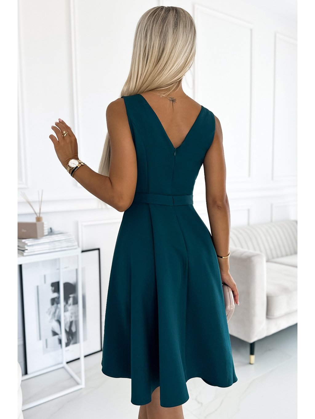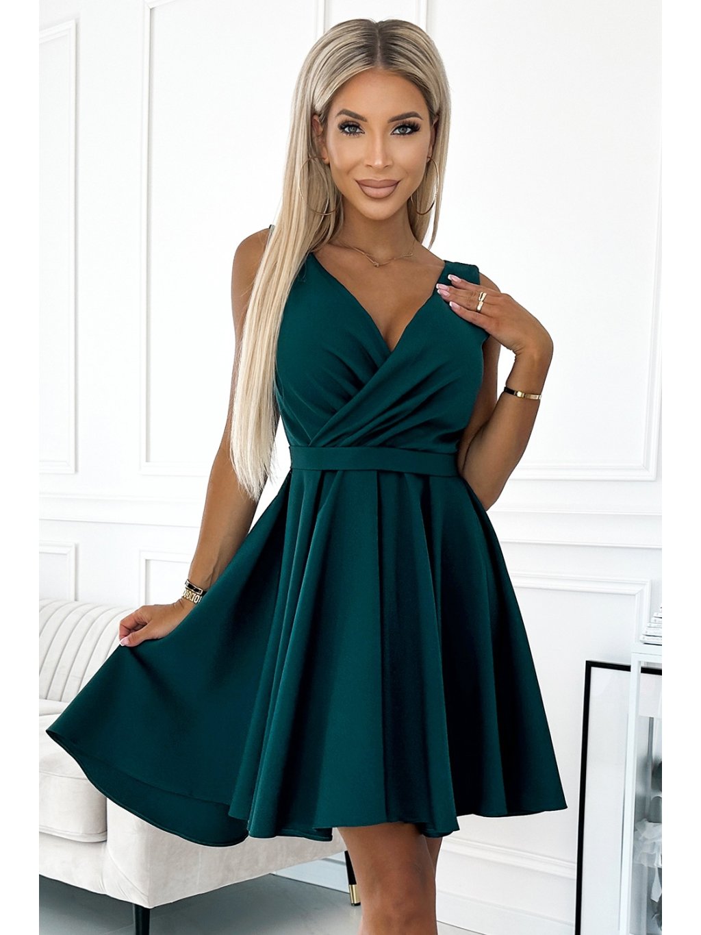 Asymetrické šaty s delšími zády, výstřihem a páskem. Šaty v lahvově zelené barvě. Sukně s delším zadním dílem bude ideální na tanec. Vyrobeno v Polsku. Značka Numoco.