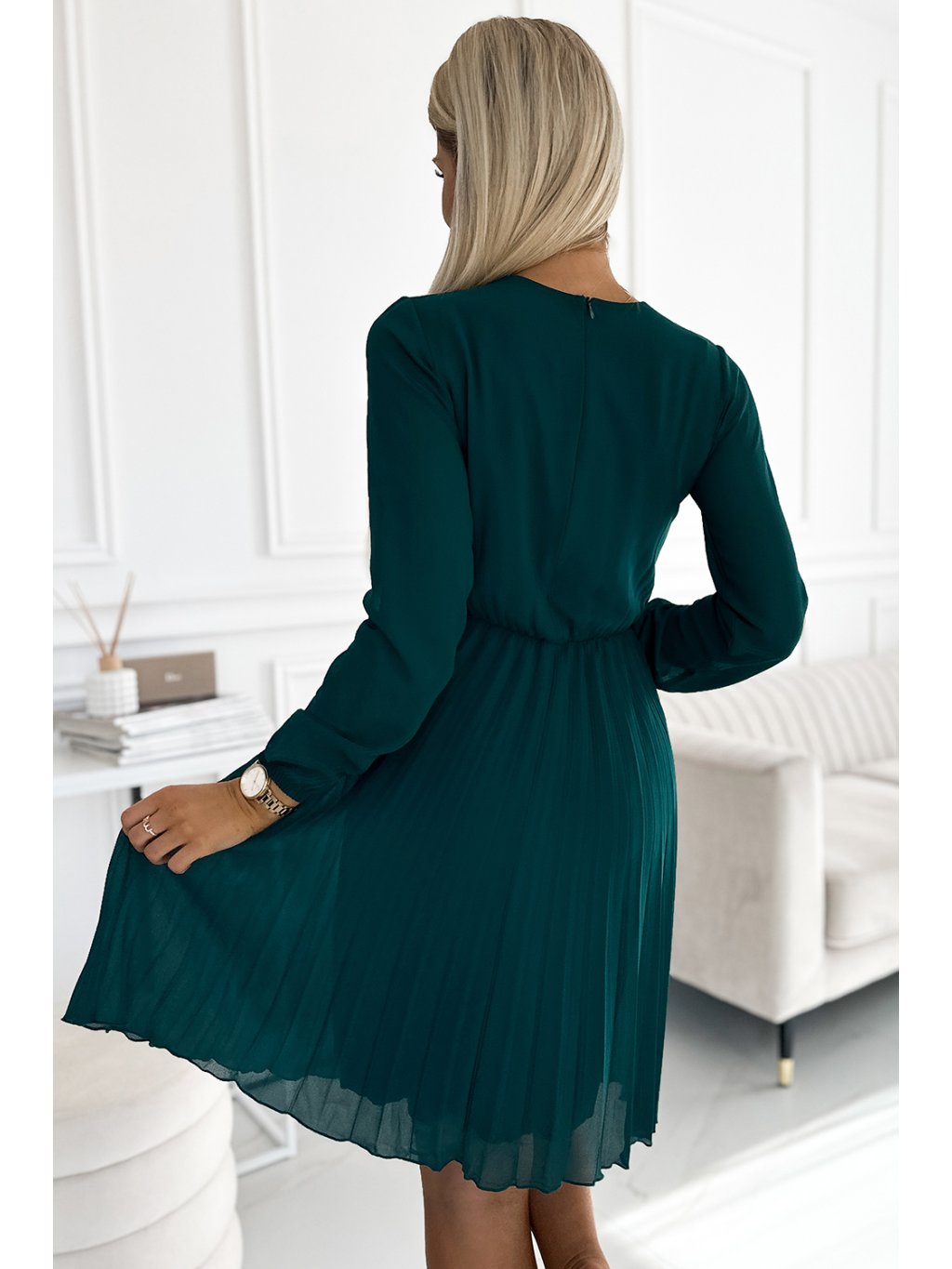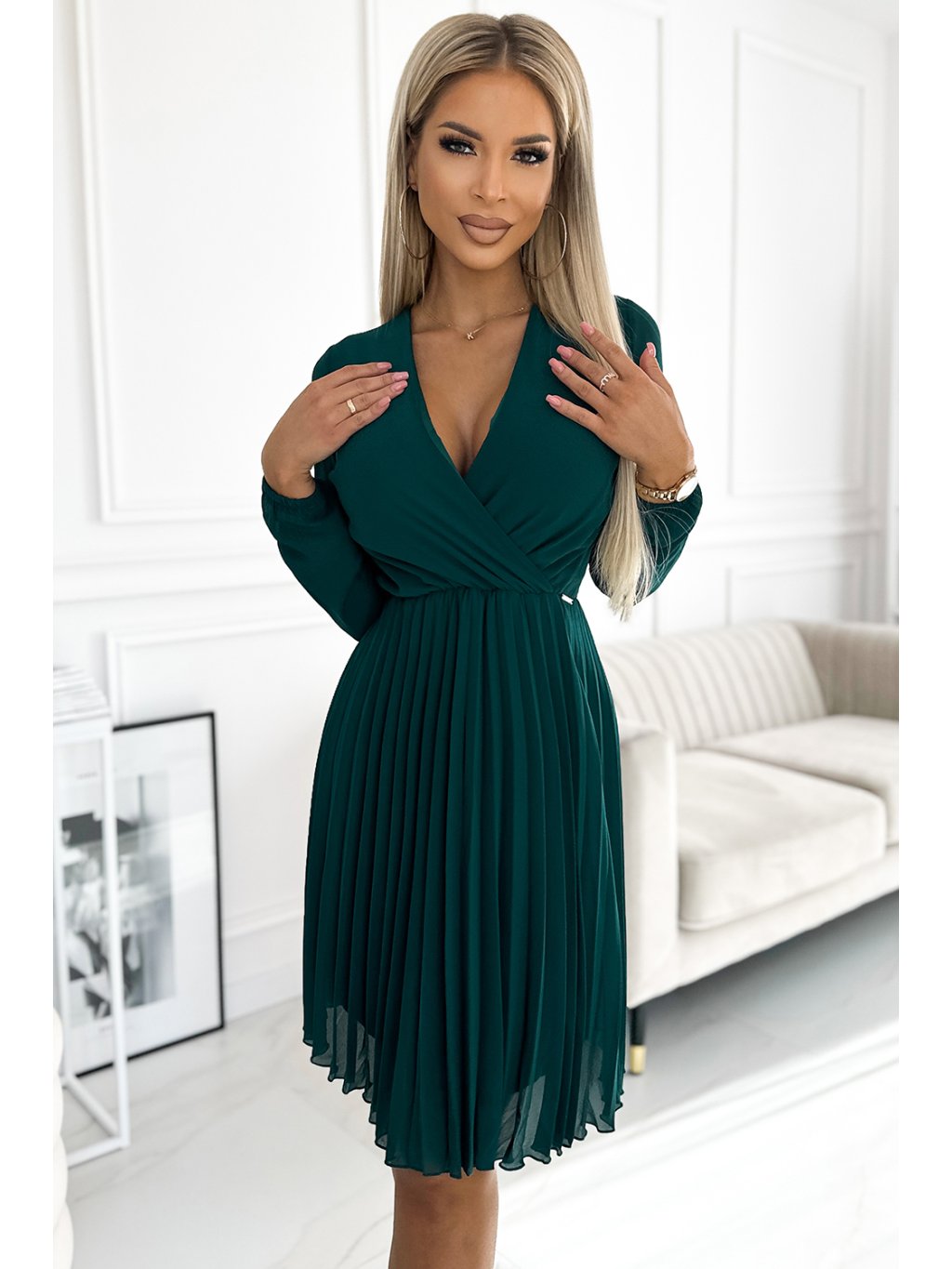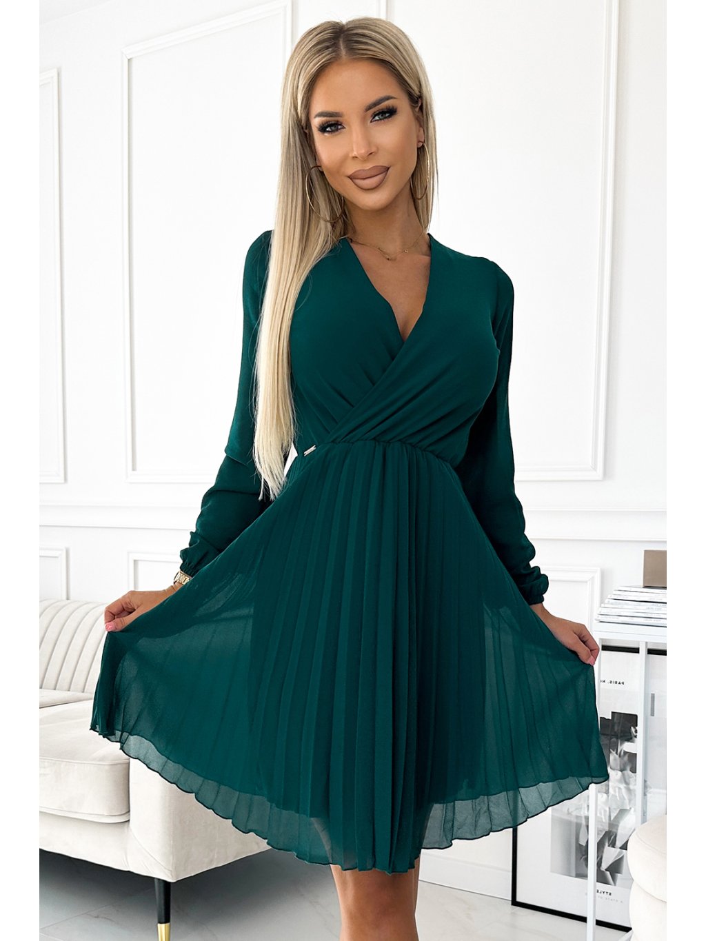 Plisované šifonové šaty s výstřihem a dlouhými rukávy. Barva: lahvově zelená. Celé šaty jsou podšité. Značka numoco. Polská výroba.Polyester 95 %