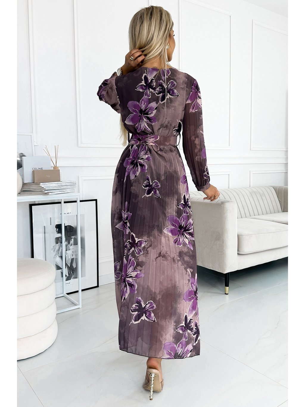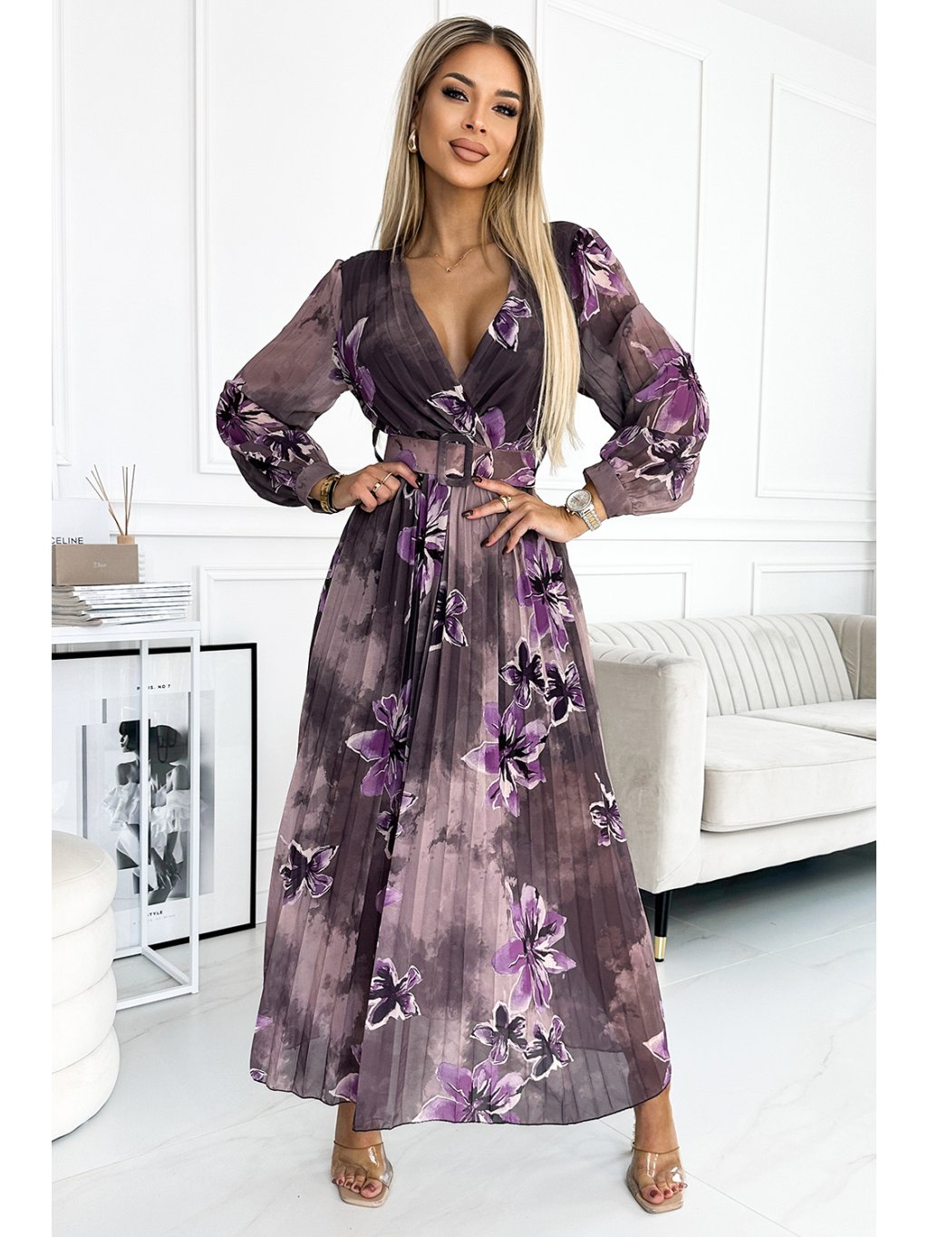 Plisované dlouhé šaty s obálkovým výstřihem, dlouhými rukávy a širokým páskem. Vyrobeno z šifonové látky na podšívce. Vzor: fialové velké květy na hnědém pozadí. Perfektní šaty pro každou příležitost. Značka numoco basic. Evropská výroba.