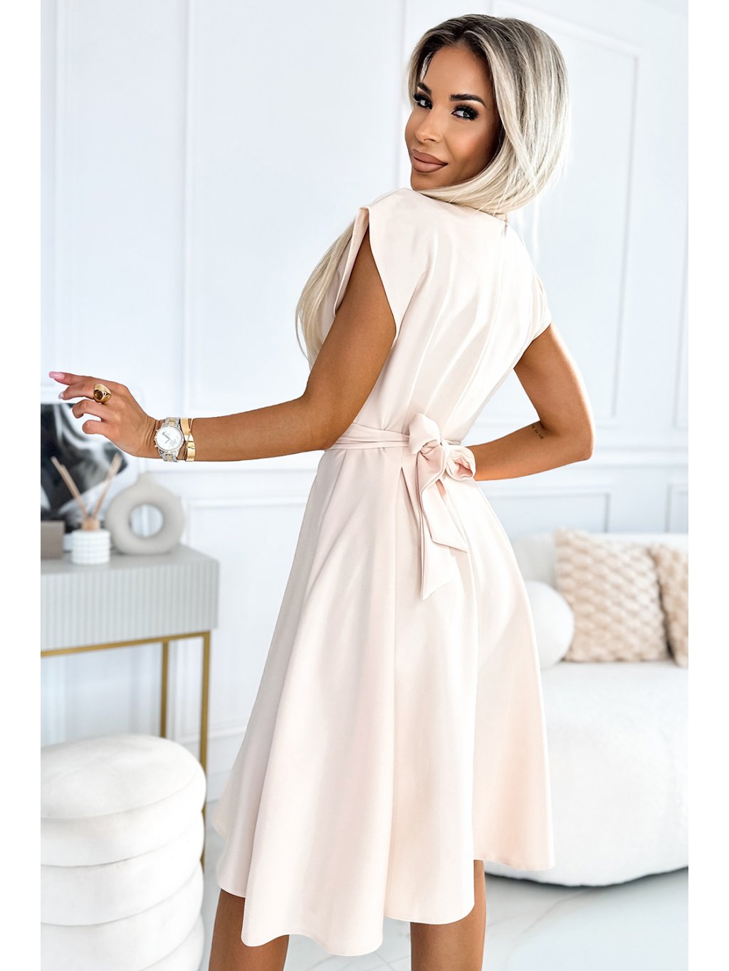 Scarlett jsou klasické rozšířené šaty ideální pro mnoho příležitostí. Mezi jejich charakteristické rysy patří elegantní výstřih a sladěný pásek, který podtrhuje ženskou siluetu. Jsou vyrobeny z tkaniny příjemné na dotek, která se skládá z 95 % z polyesteru a 5 % z elastanu, což zajišťuje nejen pohodlí při nošení, ale také lehkost a pružnost materiálu. Krásně vypadá v tlumeném béžovém odstínu, který mu dodává univerzálnost a eleganci. Značka Numoco zaručuje vysokou kvalitu zpracování a skutečnost, že šaty jsou vyrobeny v Polsku, svědčí o vysoké kvalitě výroby a důrazu na detail.