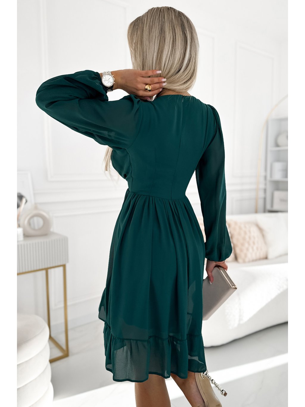 Šifonové midi šaty s dlouhými rukávy a elegantně zakončeným výstřihem. Šaty jsou v lahvově zelené barvě. Celé šaty jsou pošité podšívkou. Značka numoco. Polská výroba.