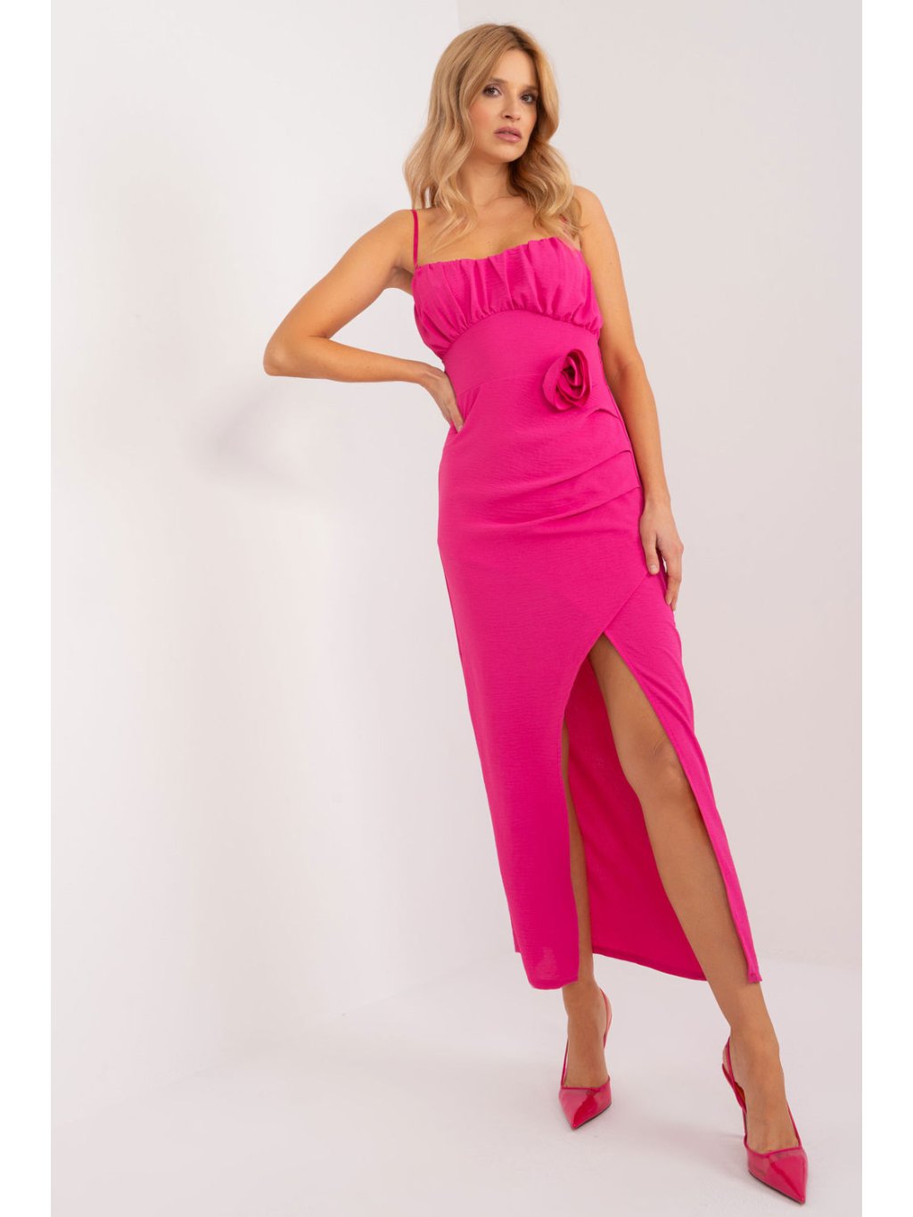 Tyto tužkové šaty jsou typickým příkladem letní elegance a sofistikovaného designu. Jsou ideální na elegantní vycházky i večírky a dodají šmrnc každé příležitosti. Neobvyklým detailem je látková ozdobná květina umístěná v úrovni pasu, která šatům dodává jemnost a romantiku. Navíc od stehen dolů se táhne ozdobný rozparek, který dodává šatům jemný smyslný nádech, zdůrazňuje ženskou siluetu a dodává jim lehkost. Šaty jsou vyrobeny z hladkého polyesteru s viskózovou podšívkou a zajišťují pohodlné nošení. Jejich midi délka a tenká ramínka zajišťují, že kulatý výstřih je jemně odhalený a zdůrazňuje krk a ramena. Řasení na úrovni prsou a na zádech dodává šatům lehkost a charakter, díky čemuž silueta vypadá obzvlášť žensky a přitažlivě. Tyto šaty jsou ideální volbou pro ženy, které chtějí v létě vypadat úžasně a cítit se sebevědomě, když vyrážejí ven. Díky jejich eleganci a šiku snadno upoutáte pozornost a budete se cítit výjimečně. Řasení s gumičkami na zádech je pružné a usnadňuje oblékání šatů. Délka šatů je uvedena s ramínky a bez nich.