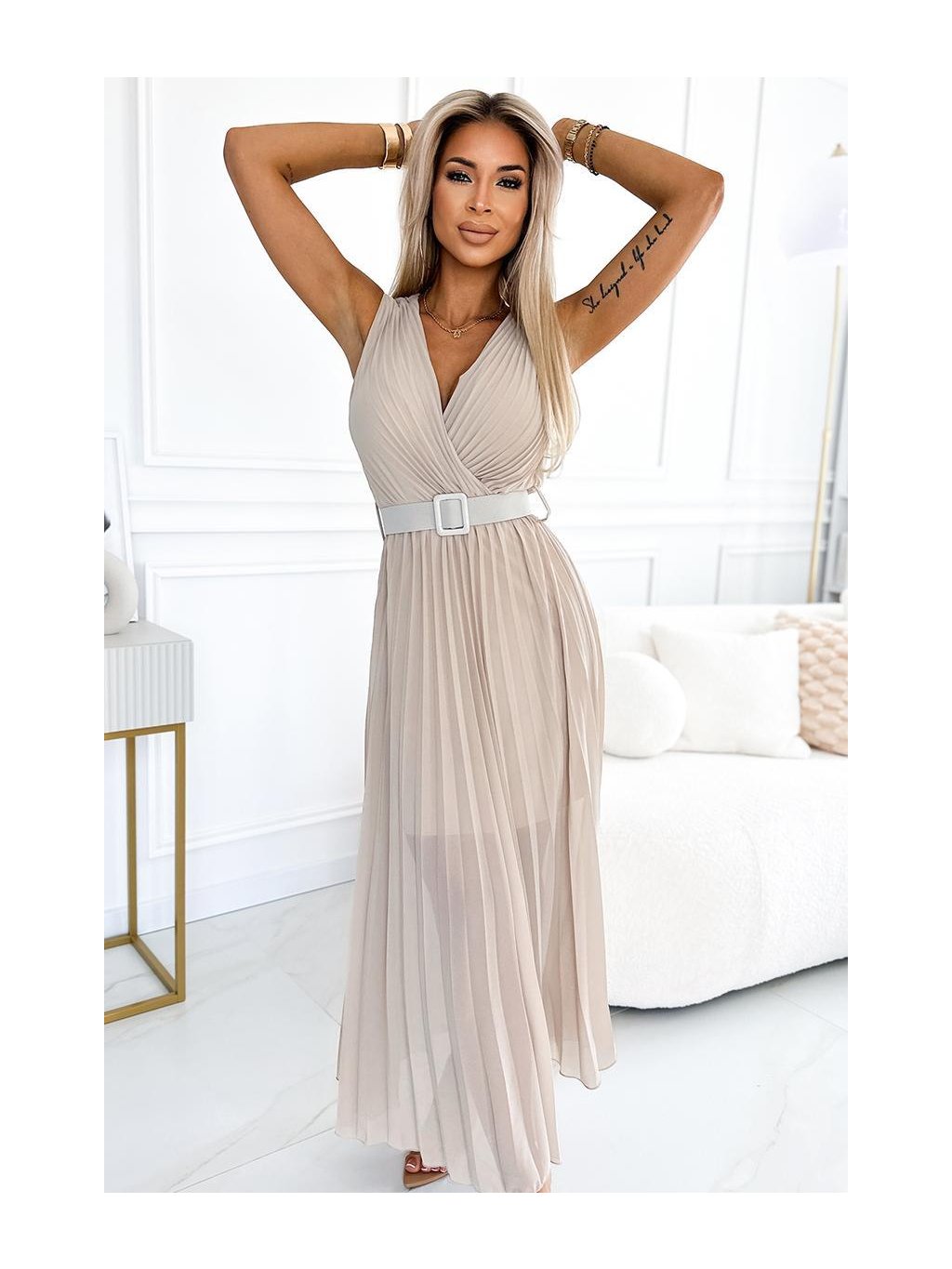 Plisované šifónové šaty s výstřihem a širokým páskem. Plisování na výstřihu a sukní přidává šatům eleganci. Šaty jsou béžové barvy a mají podšívku. Značka numoco basic.