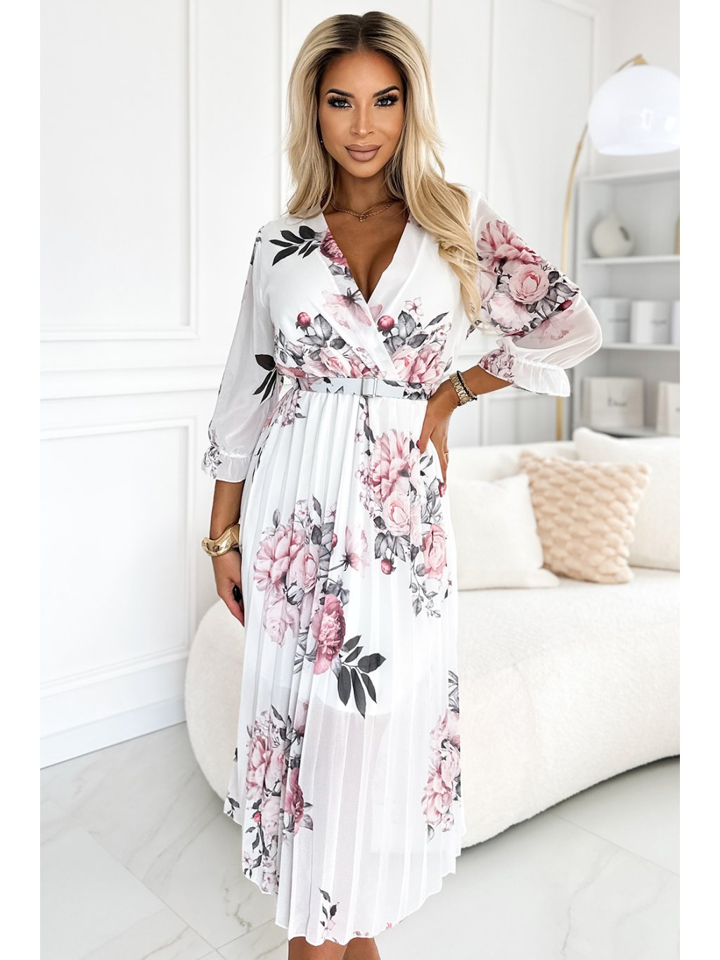 Šifonové plisované midi šaty s výstřihem a páskem. Vzor: růžové růže na bílém pozadí. Značka numoco basic. Evropská výroba.