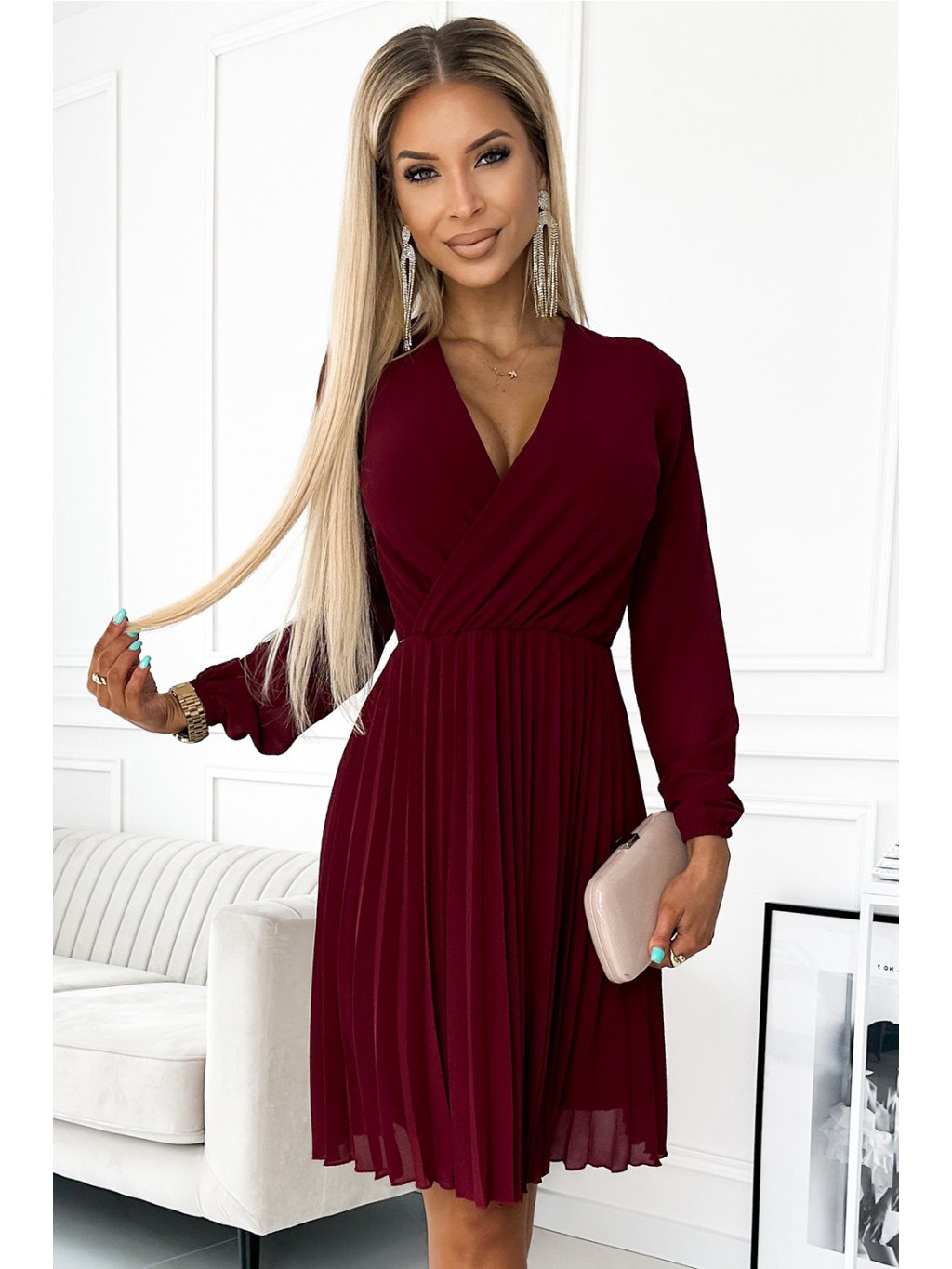 Plisované šifonové šaty s dlouhými rukávy a výstřihem. Šaty ve vínové barvě. Značka numoco. Polská výroba.